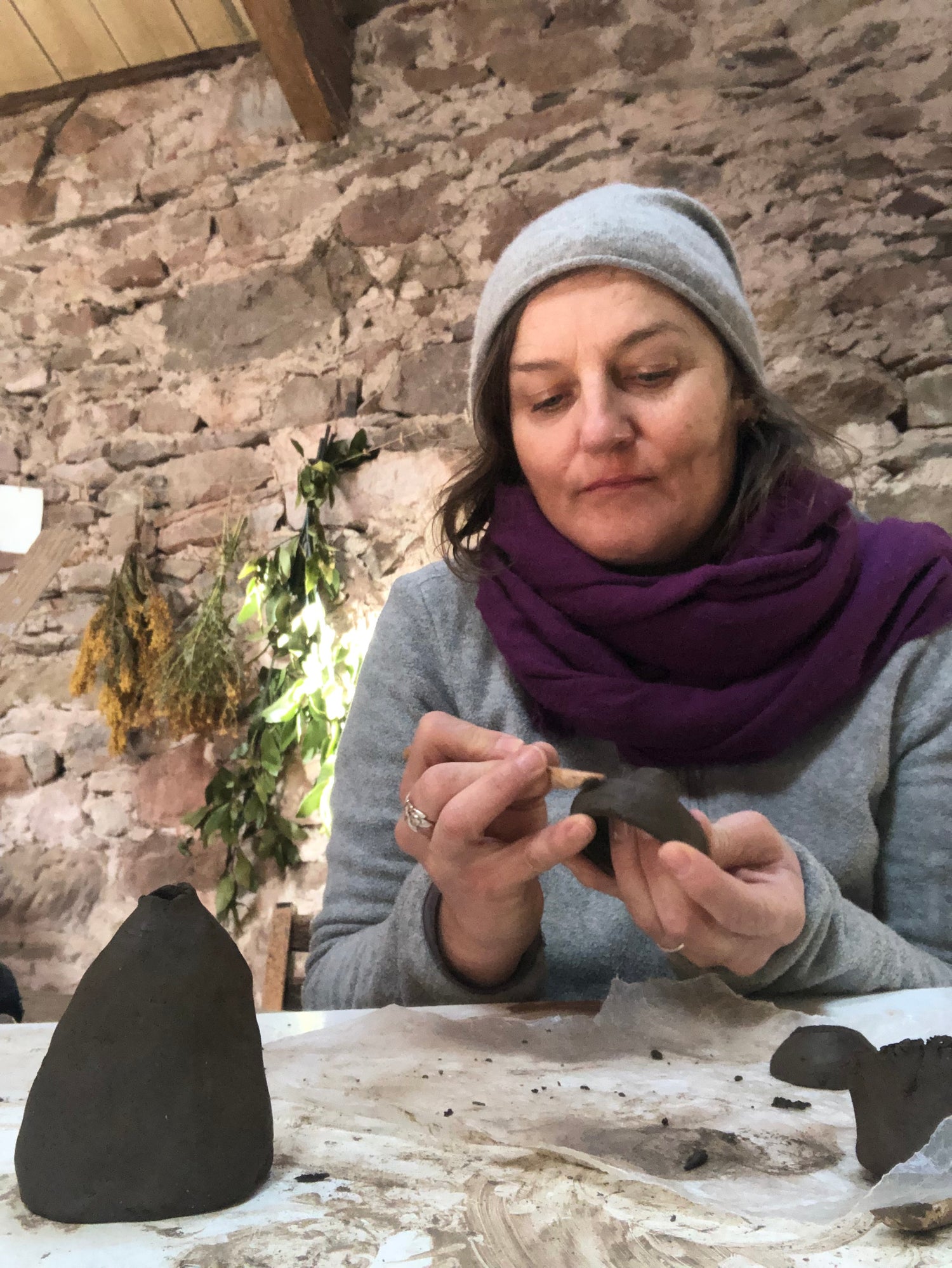 Je recherche un dialogue direct et sensible avec les matériaux bruts, que je confronte aussi entre eux. Terre, bois, pierre, pigments, cire, plâtre, éléments naturels glanés dans la nature : tout cela se mélange, se repousse, se racle, se taille et je cherche à donner à la matière un souffle d’équilibre et de silence. Je suis dans un travail foisonnant, nourrie de l’appel de nouvelles découvertes, un travail qui prend des formes et des formats multiples et débouche sur des créations déclinées dans divers média : sculptures et installations, parfois participatives, dessins, peintures, objets d’arts. J'essaie de restituer un chuchotement de langage sacré, qui inviterait le monde des formes à enchanter le quotidien.