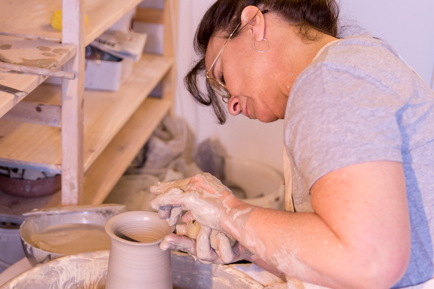 Après avoir ouvert un atelier boutique avec ma fille dans le 9eme à Paris, j'ai décidé d'installer mon atelier de production chez moi, en région parisienne, dans une pièce dédiée à mon travail. Je travaille uniquement les grès ( blanc, noir, roux, lisse chamotte) car c'est une matière première qui me permet une multitude de possibilités.
