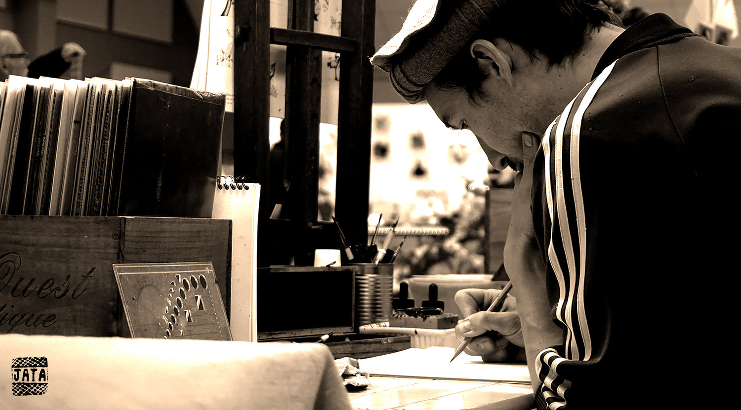 L'utilisation de l'encre de Chine est un savoir-faire complexe et au bout de dix ans je continue d'apprendre. La grande difficulté est de prendre soin de son matériel car l'encre "encrasse" tout. Elle sèche sur les plumes, brûle les poils des pinceaux, se fige dans les conduits des Rotring (stylos d'architecte rechargeables). Les papiers se tâchent, souffrent de la chaleur, de l'humidité... J'ai donc développé des astuces, des techniques, piochées souvent parmi les "trucs" des dessinateurs de BD : utilisation de tables lumineuses, usage de "rustines" pour rattraper une erreur... Bref, l'artisanat dans toute sa splendeur !