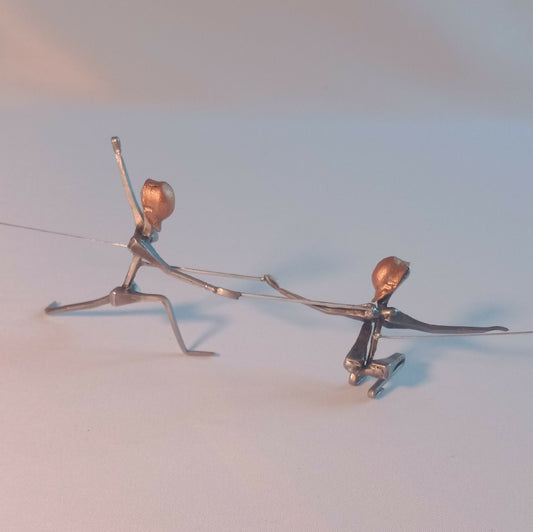 Statuette d'Escrimeuses en Posture Acrobatique. Réalisée en acier à la main