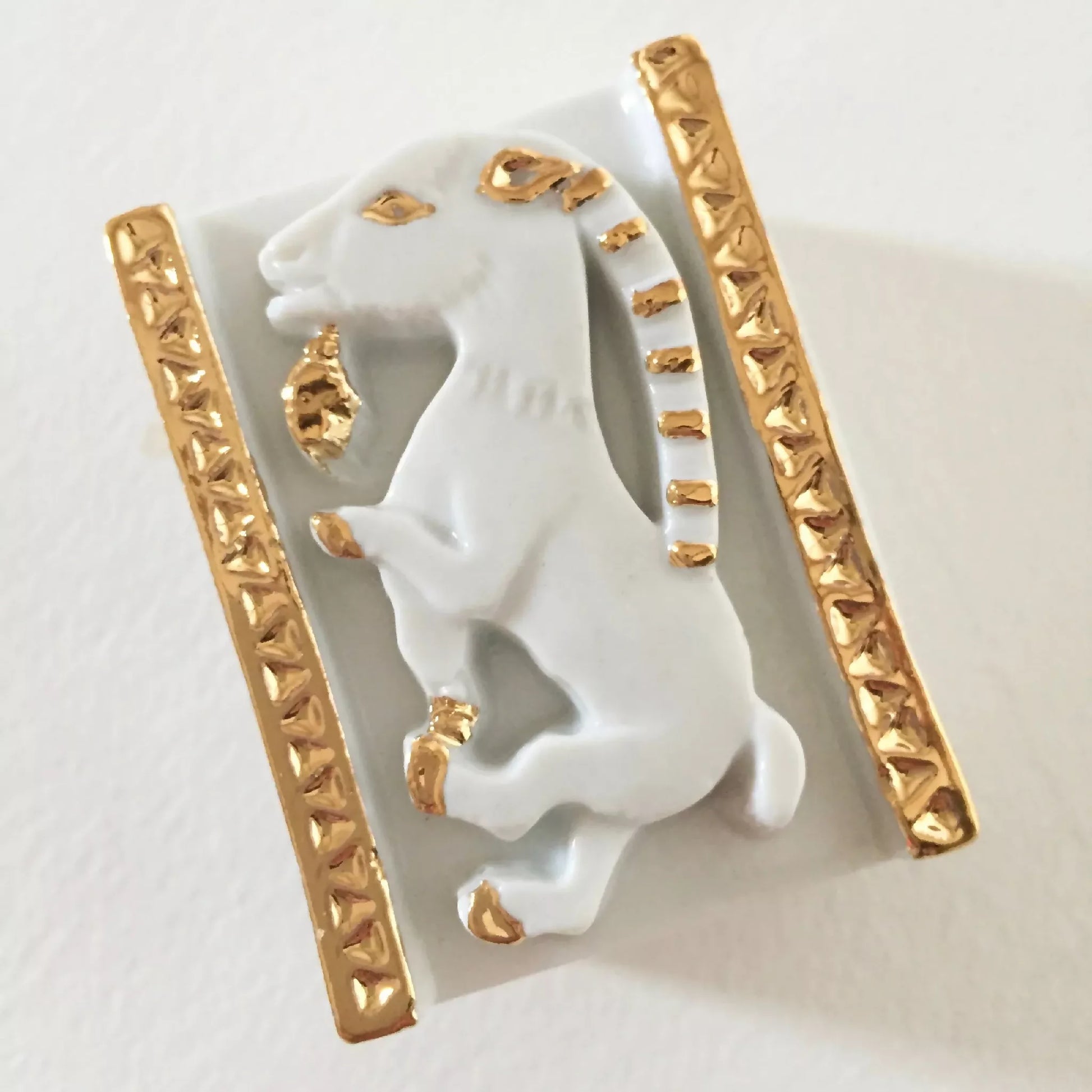 Boite à bijoux Chèvre en porcelaine émaillée blanc et décorée à l'or liquide. La symbolique de la chèvre est liée à l'envie de liberté et au désir d'émancipation Collection Nuits Romanes.