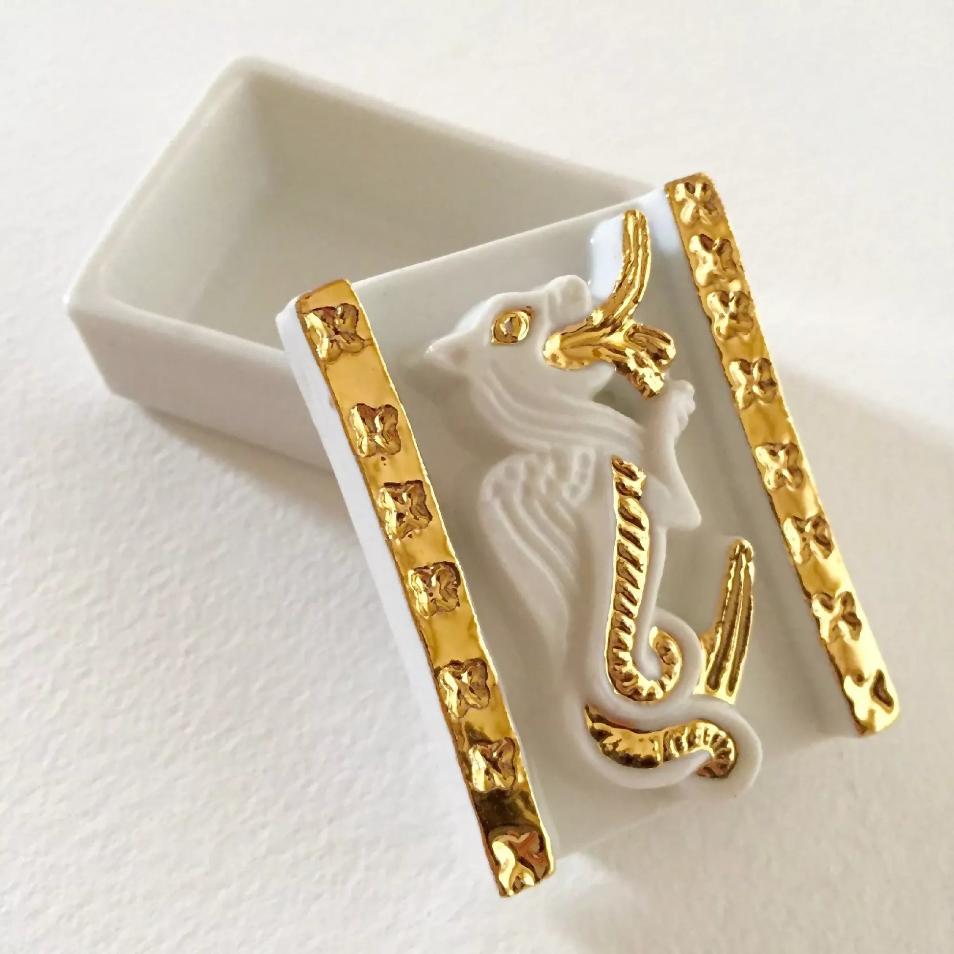Boite à bijoux Dragon en porcelaine émaillée blanc et décorée à l'or liquide. Le Dragon est le gardien de votre trésor. Il représente les forces de la nature. Collection Nuits Romanes