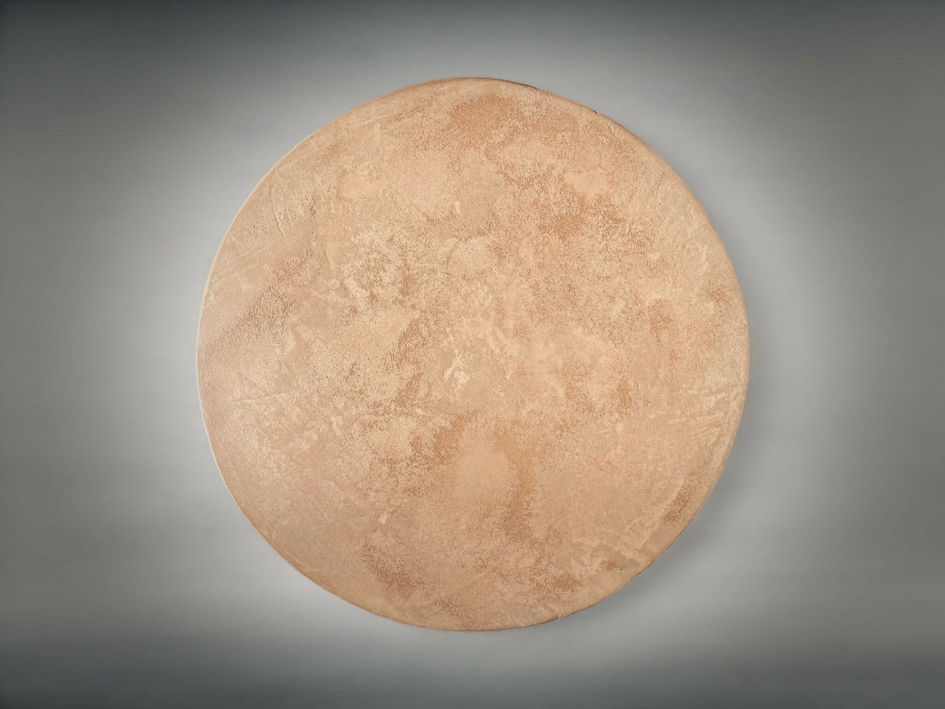To create this side table/bedside table, I built a wooden cylinder which I then covered with straw marquetry in a herringbone pattern with a gradient of vibrant, eye-catching colors. Guaranteed to create a striking effect. The top is made of ochre waxed concrete with a two-component satin varnish finish (providing optimal protection against wear and tear, similar to kitchen countertops).