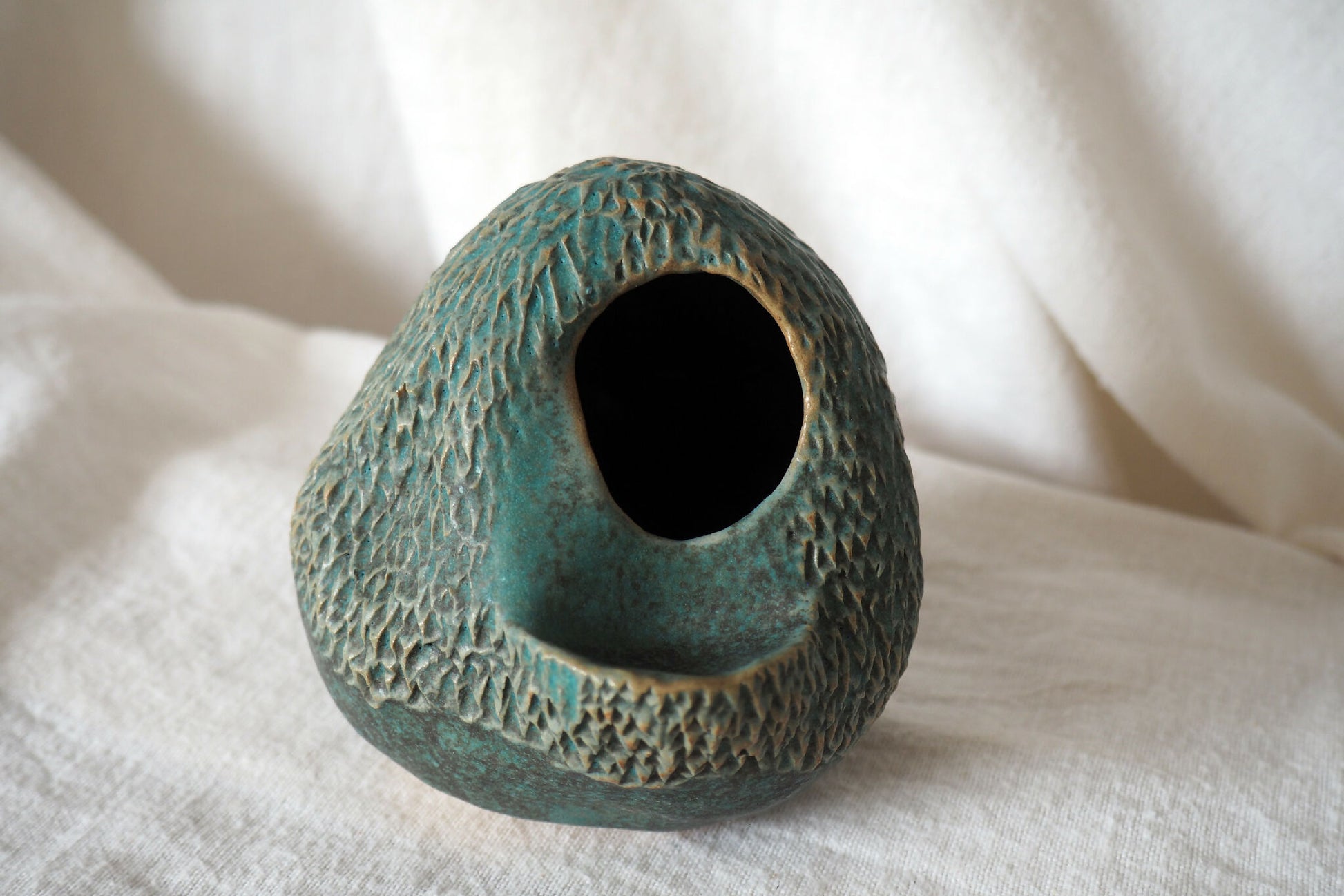 Petite pièce en grès de Saint Amand, faconnée à la main avec la technique du pincé, émaillée à l'intérieur et à l'extérieur et cuite à haute température.