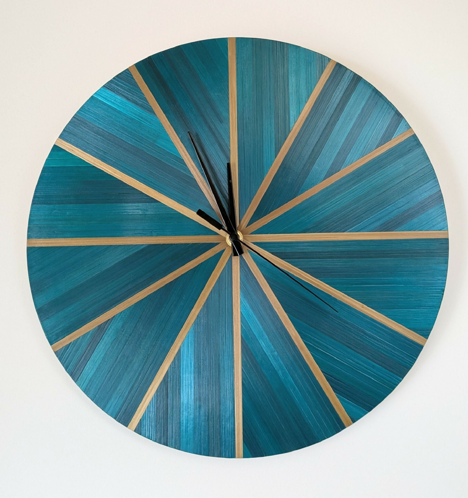 Horloge murale de style Art Déco avec Marqueterie de Paille de couleur verte nuancée bleu pour le motif droit et cadran en paille dorée.La marqueterie de paille est une technique très longue et luxueuse qui consiste à appliquer de la paille de seigle teintée sur différents supports. Je sélectionne chaque brin minutieusement, je les ouvre, les aplani et je viens les appliquer un par un sur différents support (mobilier, objets de décoration, tableau...).