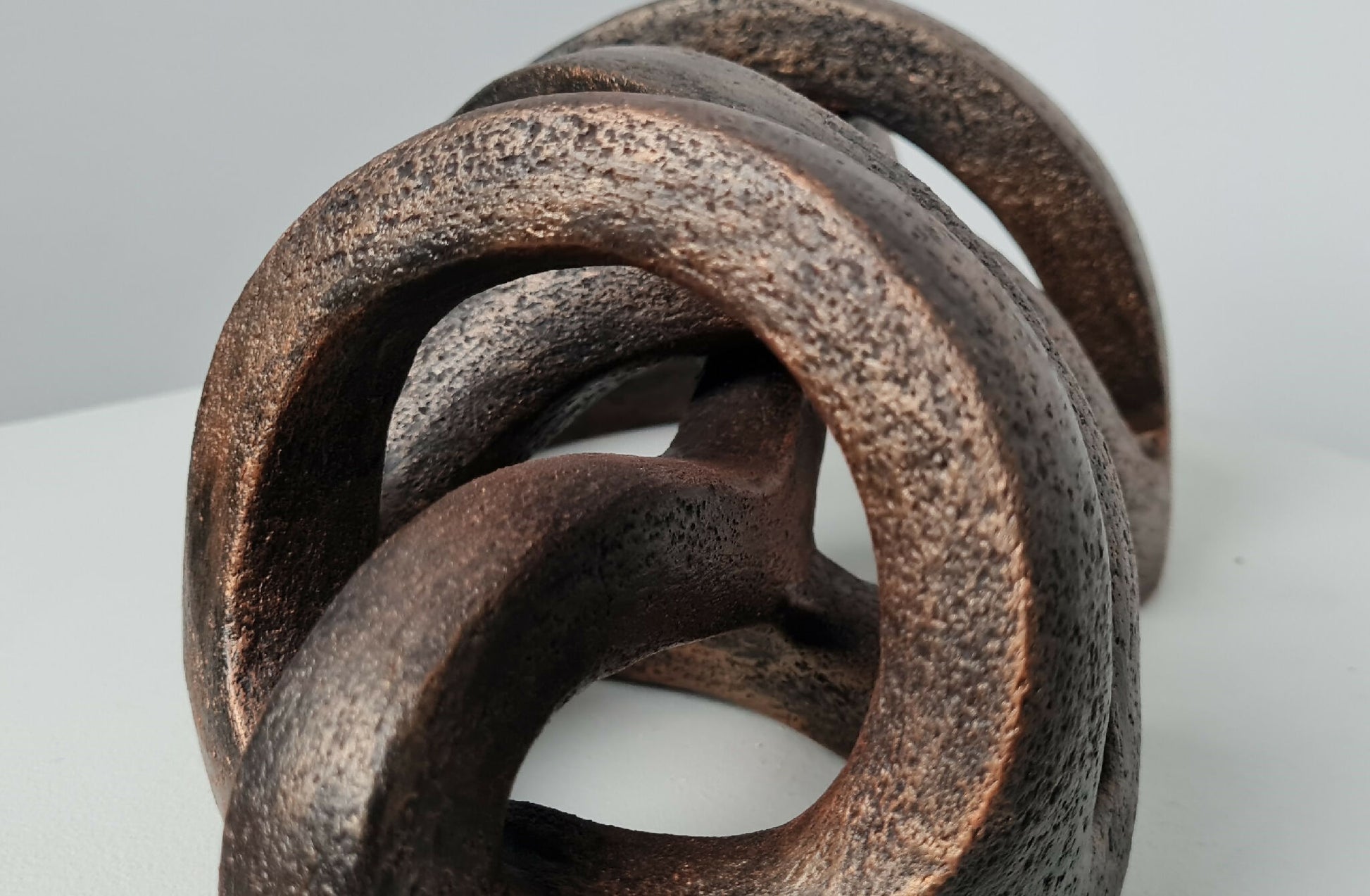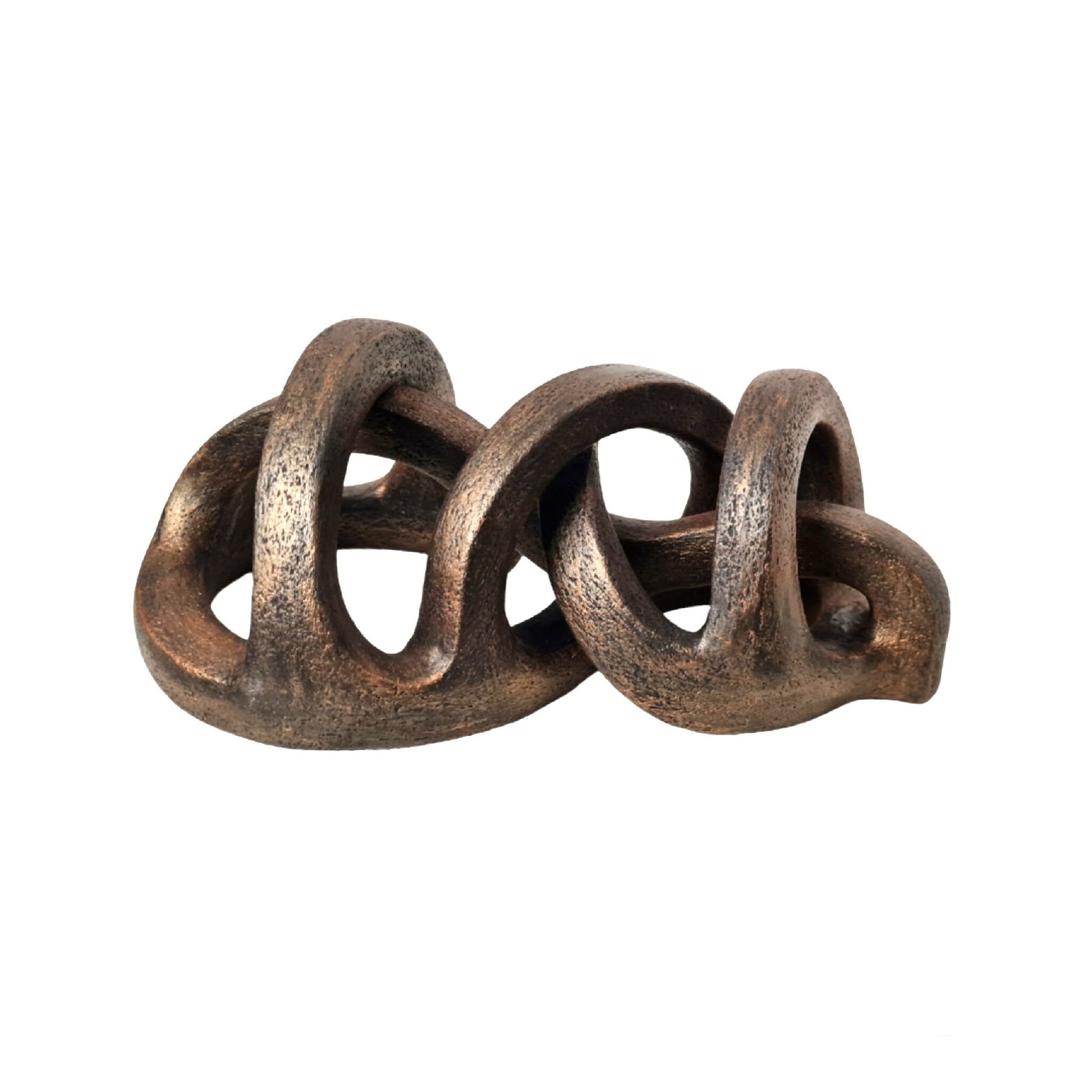 "Le Tunnel" est une sculpture contemporaine en argile (terre cuite) patinée . Evoquant la force et la continuité, les formes entrelacées en spirale illustrent le chemin de nos pensées, tandis que la texture et la couleur cuivrée apportent une présence chaleureuse et rassurante, une issue favorable...