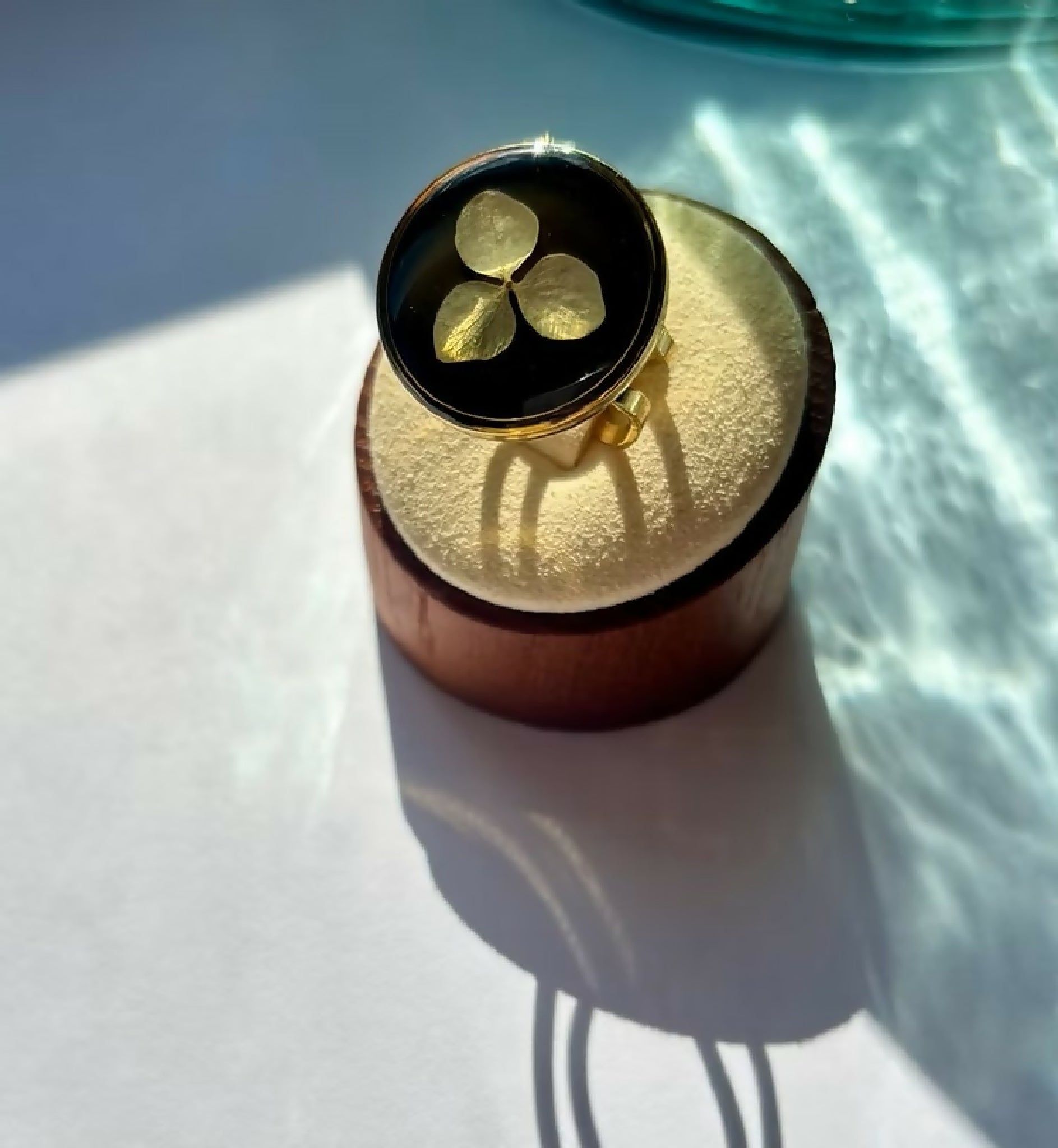 Cette bague ronde en acier inoxydable doré au fond noir, met en valeur une jolie fleur d'hortensia parfaitement préservée dans la résine.