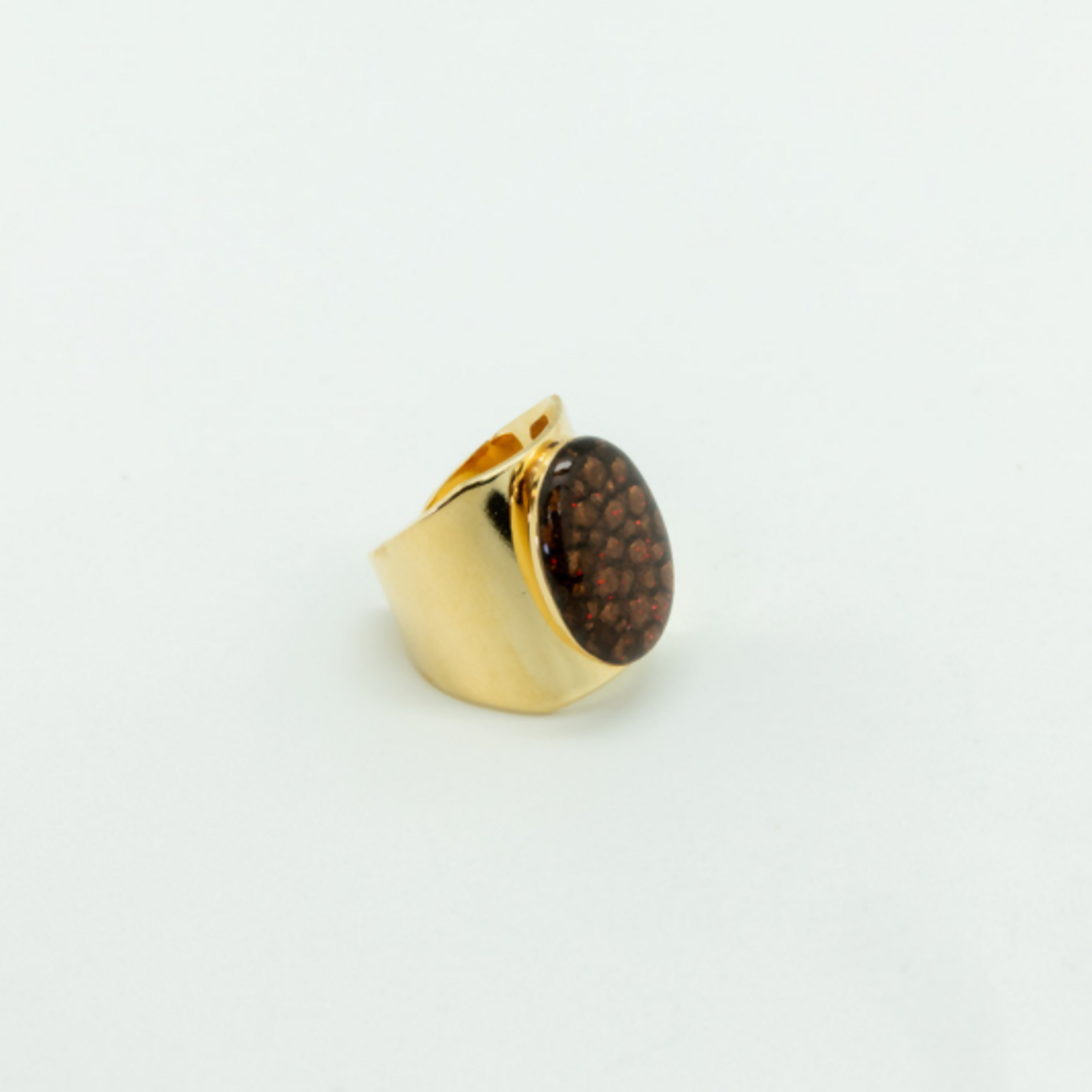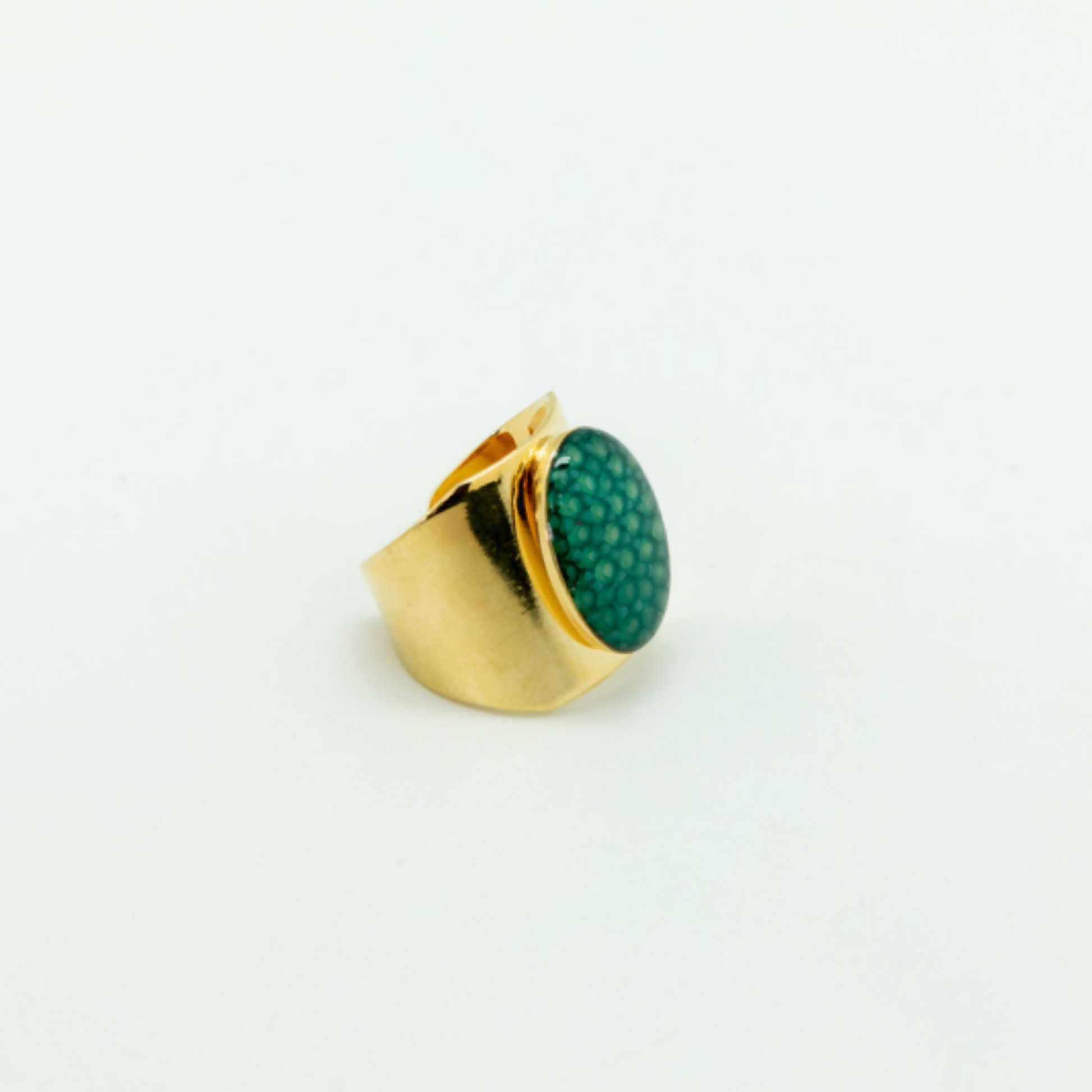 Le cabochon résiné est réalisé à partir de galuchat upcyclé provenant des chutes de la maroquinerie de luxe.