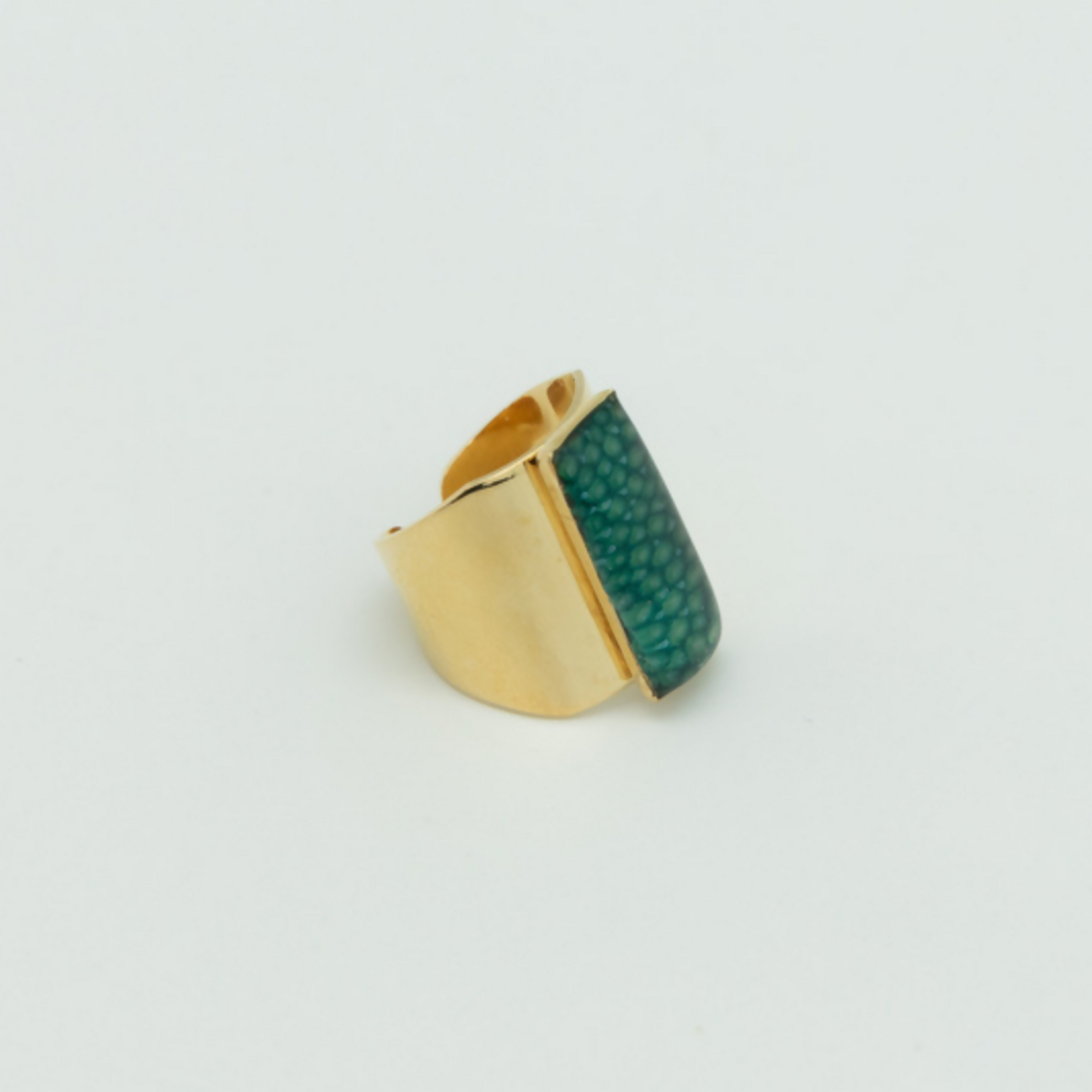 Le cabochon résiné est réalisé à partir de galuchat upcyclé provenant des chutes de la maroquinerie de luxe.