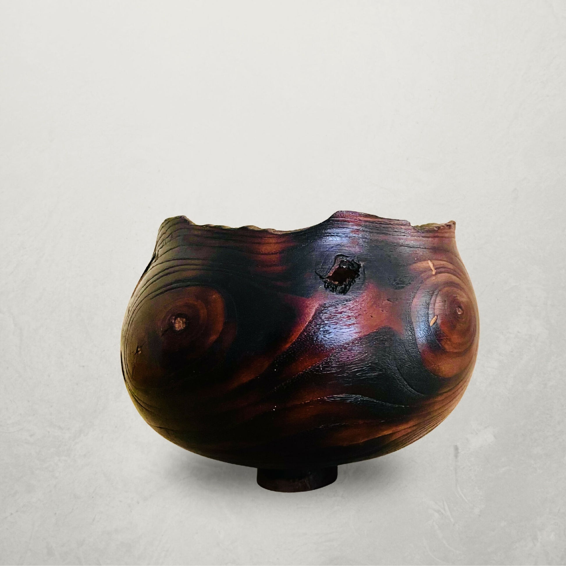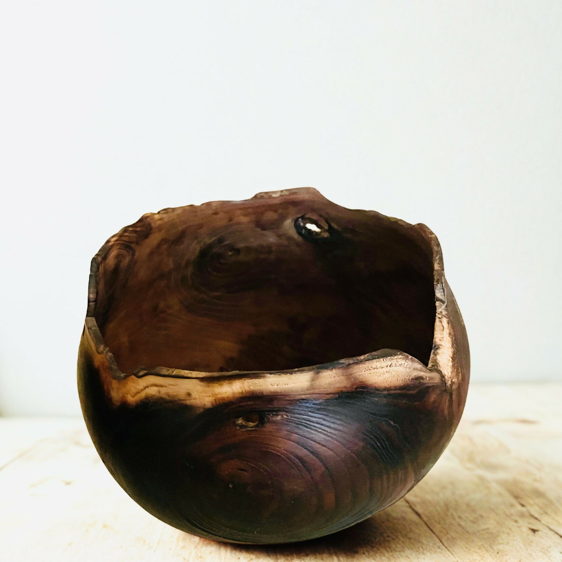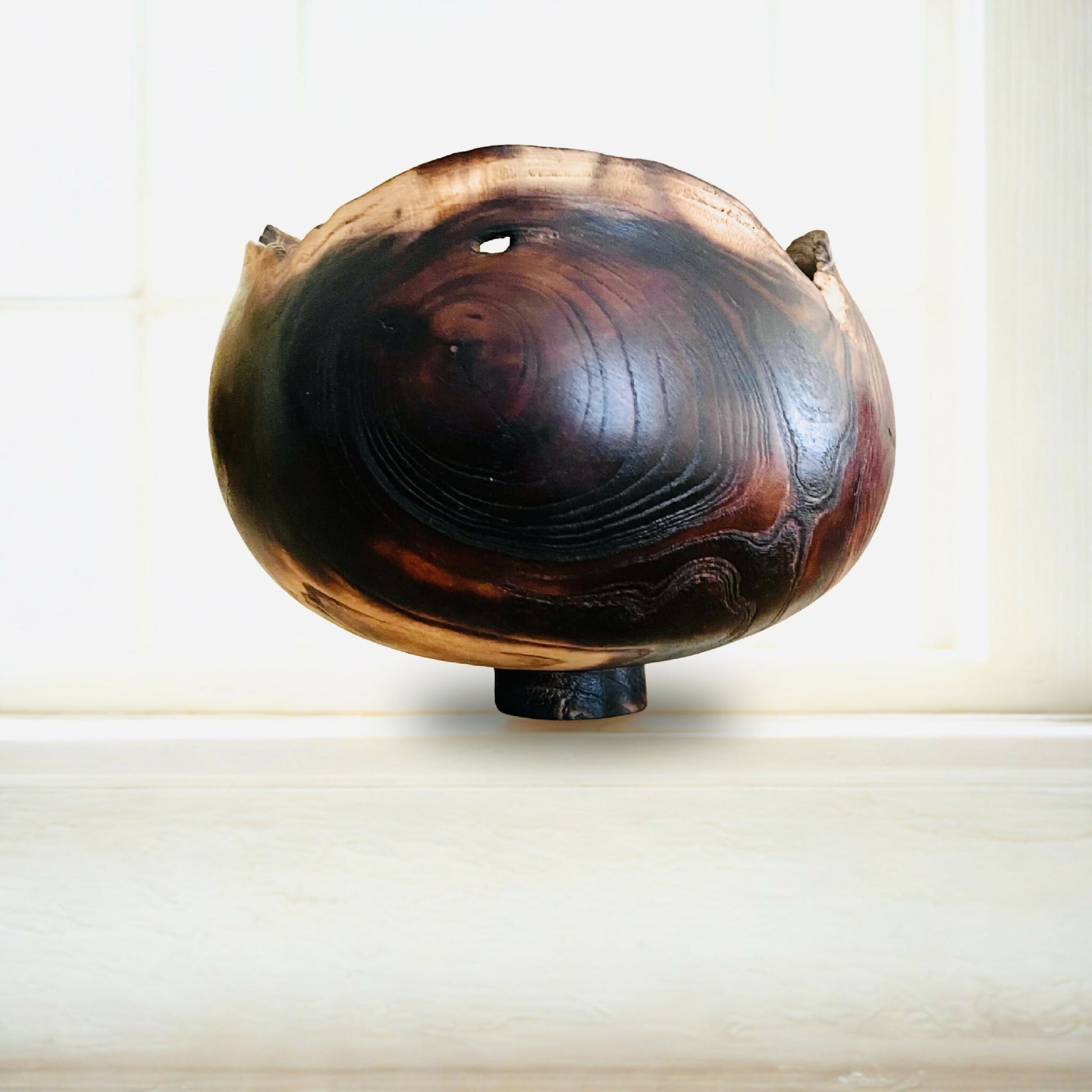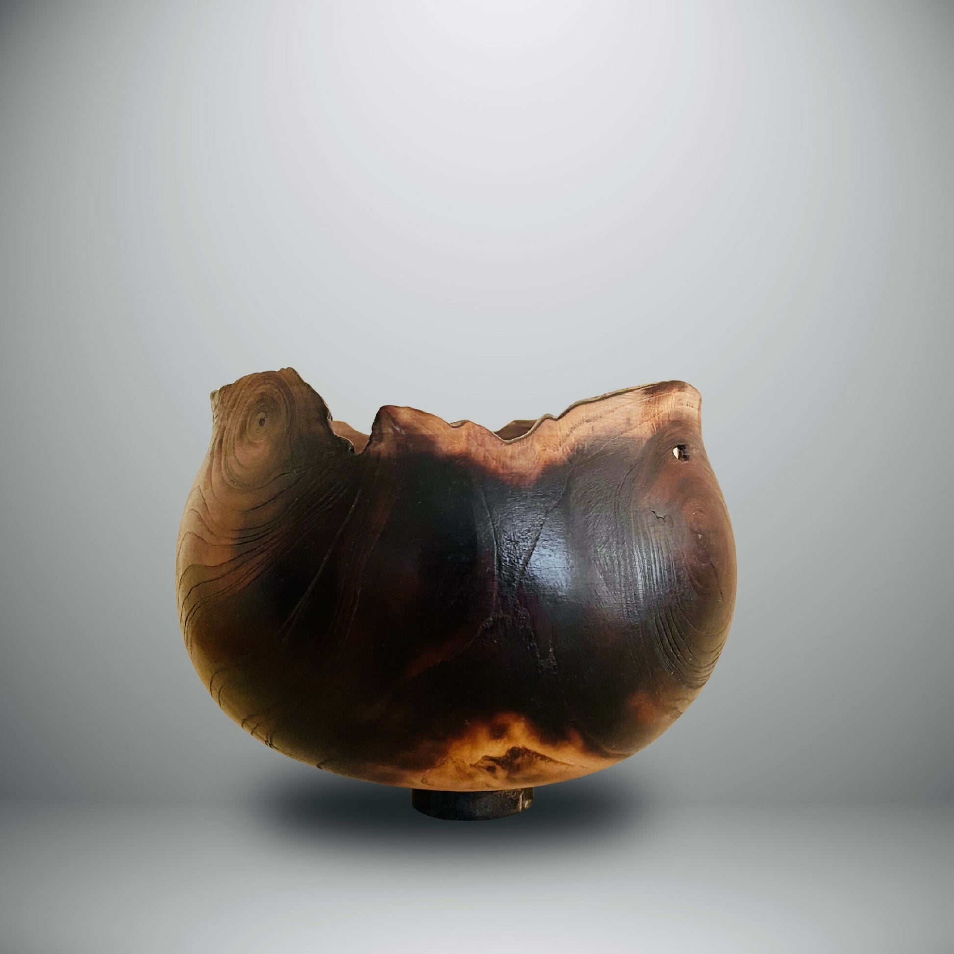 Né de la rencontre entre la main et la matière, ce bol en bois tourné conserve l'empreinte vivante de l'arbre dont il est issu (mûrier-platane travaillé encore vert). Ses lignes douces contrastent avec son bord irrégulier, comme rongé par les flammes. Les nuances sombres et profondes, traversées de reflets chauds, rappellent la braise et le feu qui réchauffent et transforment.