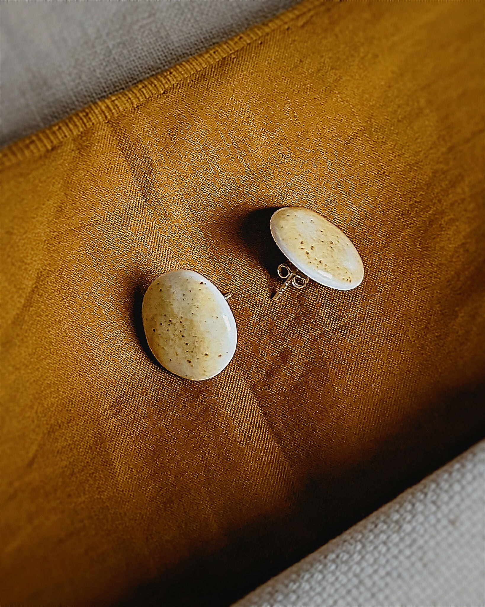 Ces boucles d’oreilles puces sont façonnées à la main en porcelaine - fine, émaillées d’un jaune pastel doux parsemé de petites nuances brunes comme des traces du soleil sur la matière. Leur éclat discret évoque la chaleur et la lumière d’un matin d’été.