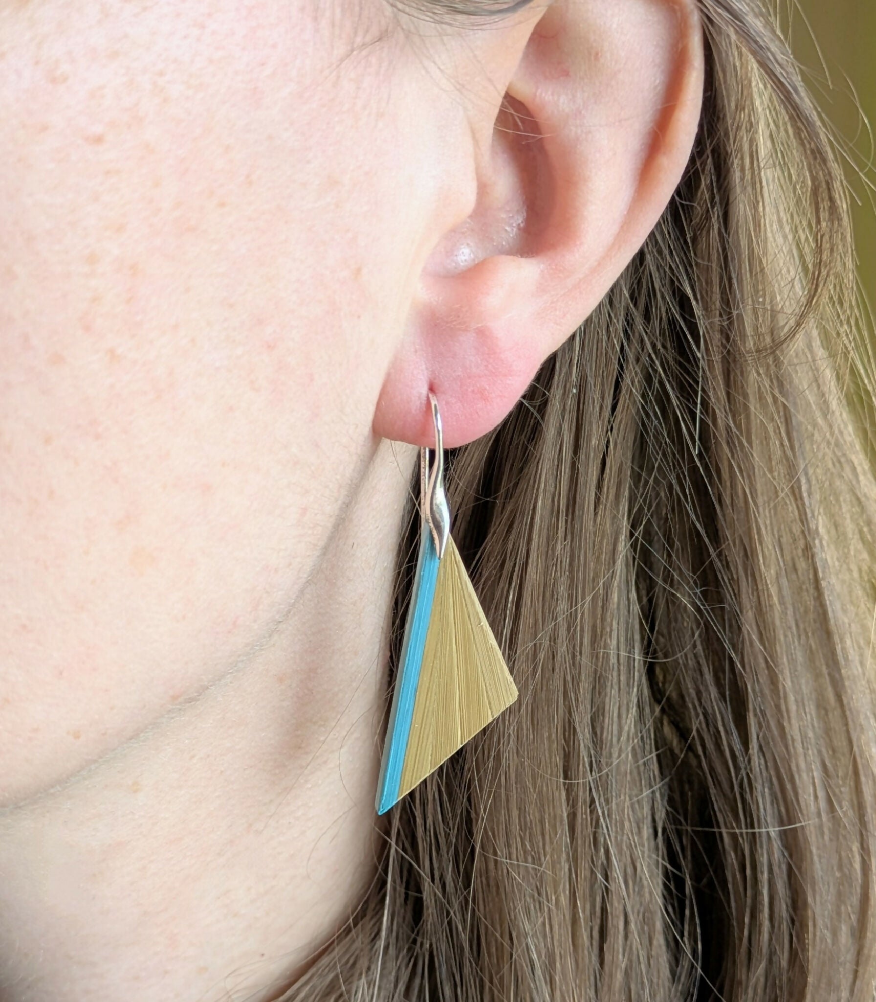 Boucles d'oreilles Triangulaires avec Marqueterie de Paille Dorée et Turquoise crochets argent 925