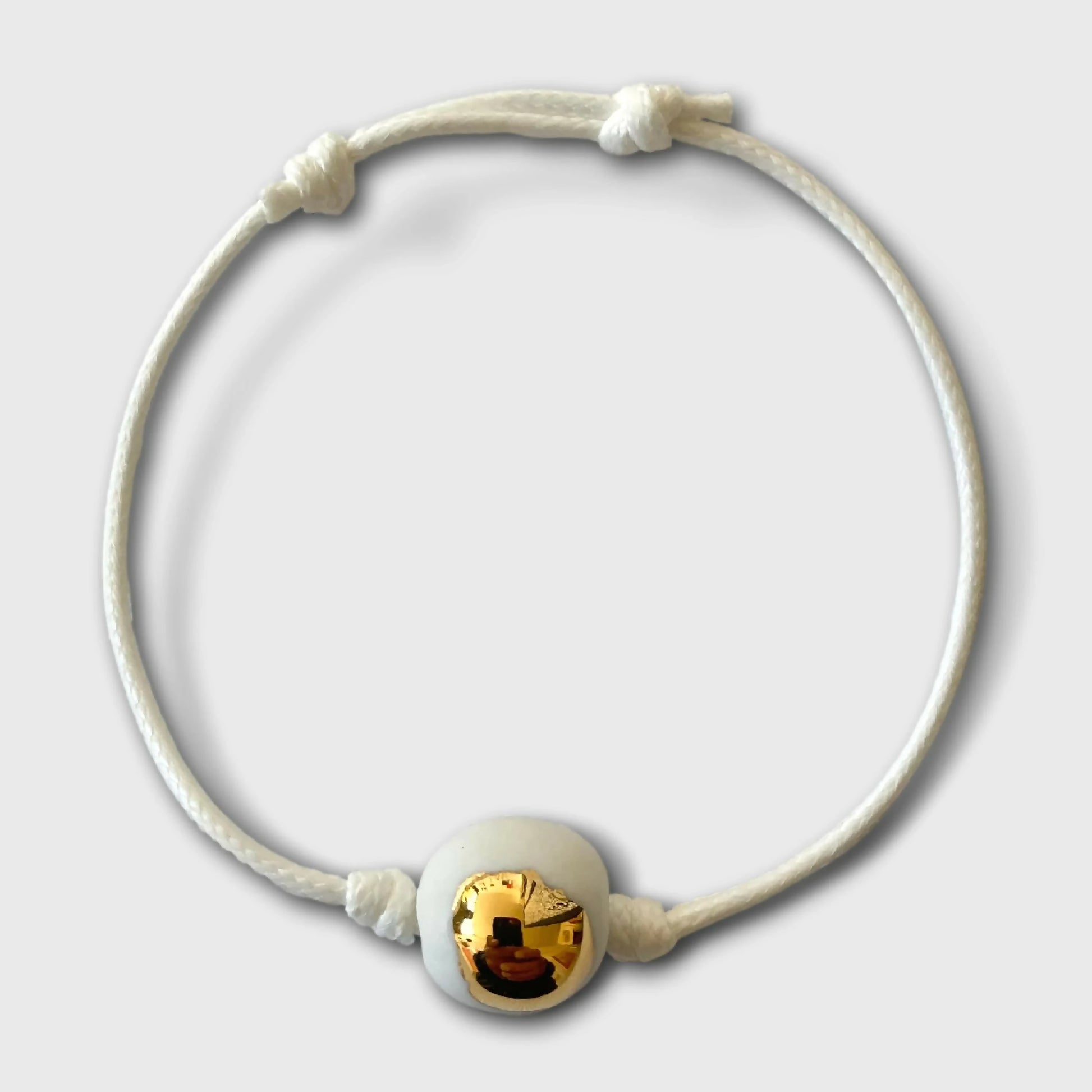 Bracelet réglable, ajustable, par deux nœuds capucins, qui permettent d'ajuster le bracelet à votre convenance. Il présente une perle de porcelaine délicatement émaillée d'une goutte d'or étincelant, enfilée sur un cordon blanc de coton ciré de diamètre 2 mm. A la fois délicat, léger, discret et très présent, chic et élégant, ce bracelet ornera votre bras de façon incomparable. Ce bracelet est une pièce unique.