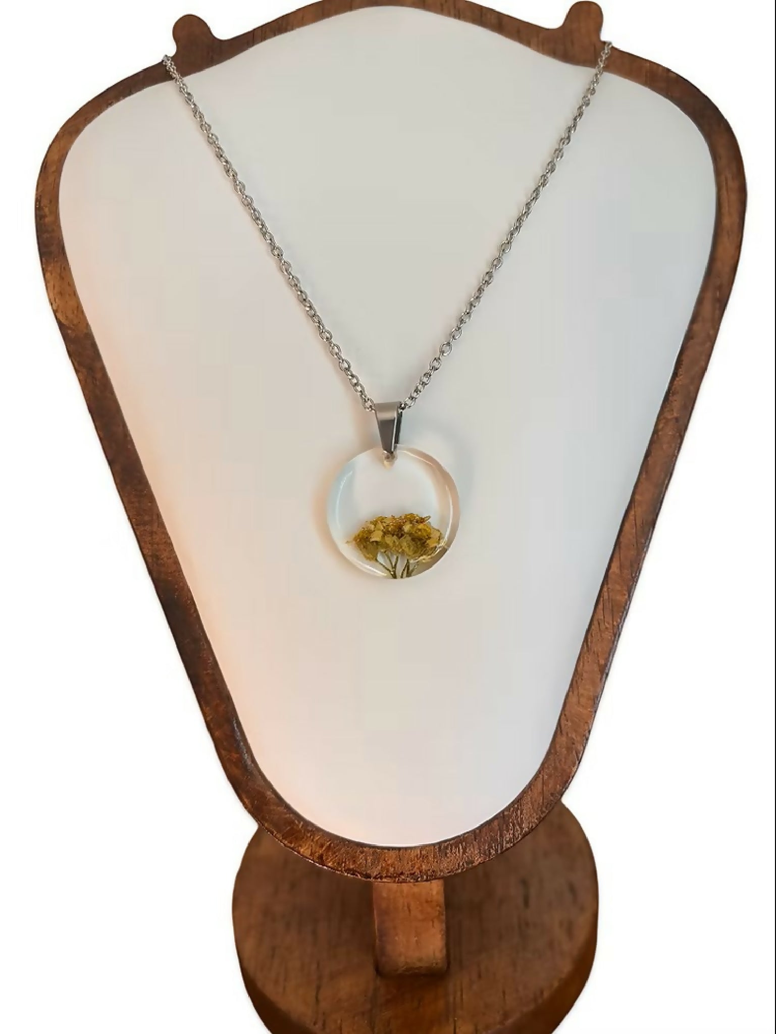 Ce collier en acier inoxydable, avec son pendentif en résine transparente, met pleinement en valeur la beauté des fleurs d'achilée millefeuilles qui se trouvent à l'intérieur. L'achilée millefeuilles symbolise le soulagement, la guérison et la protection.