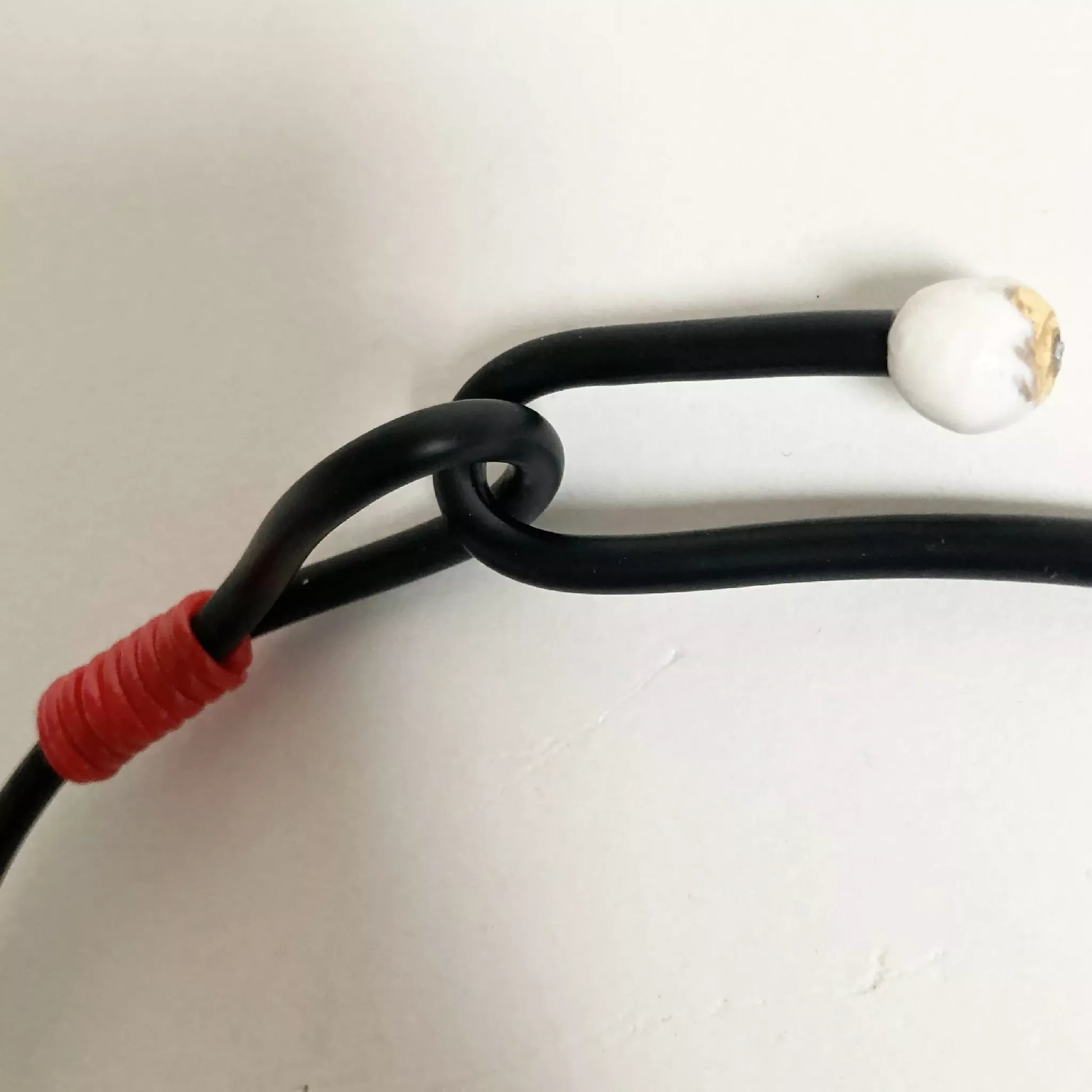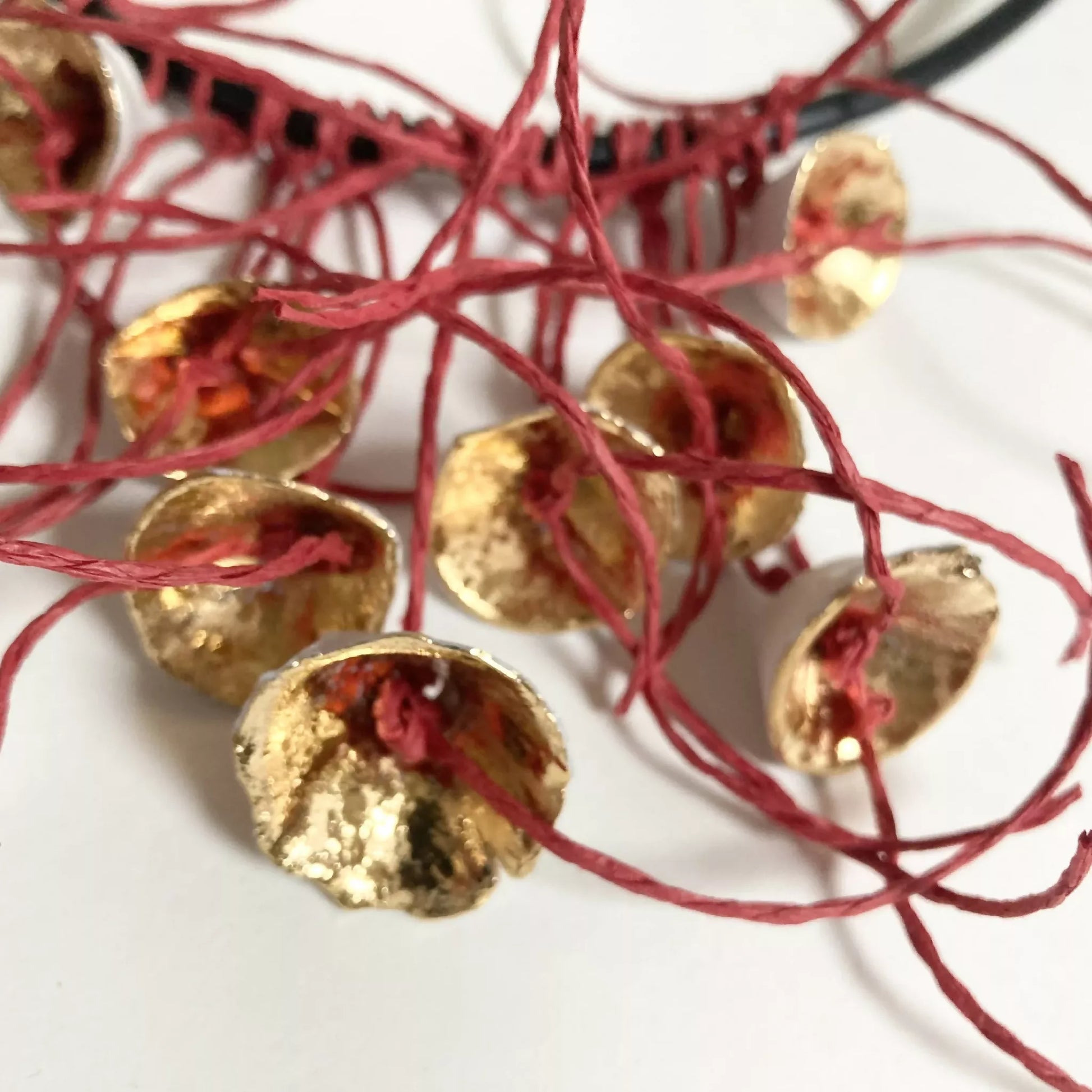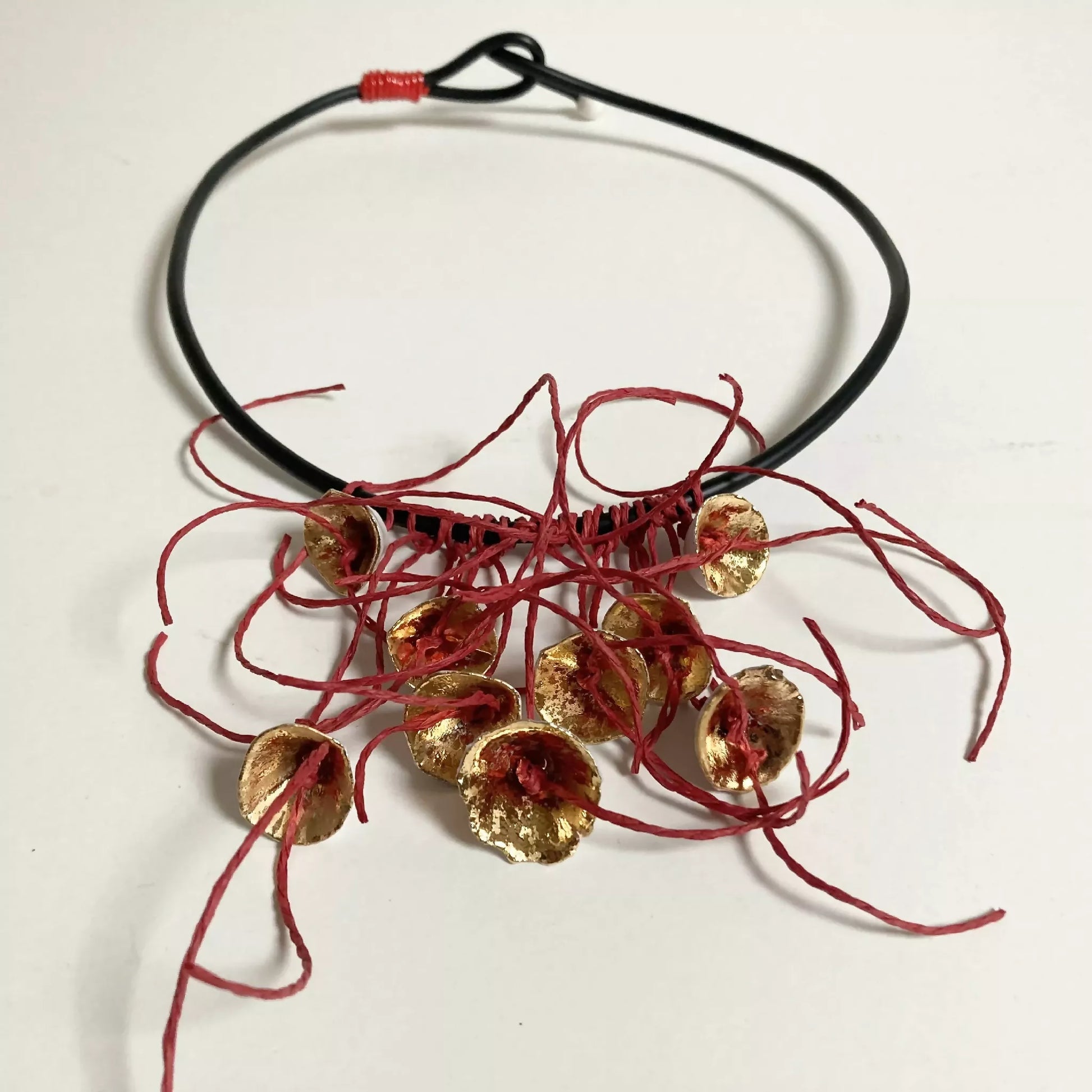 Collection "Fleur de printemps 2". Plus qu'une parure de corps, une sculpture à porter. Pièce unique, aux matières précieuses, de porcelaine au décor d'or liquide. Le cordons est en caoutchouc noir mat. Les fils sont en ficelle de papier rouge. Ce bijou d'artiste unique est créé pour vous.
