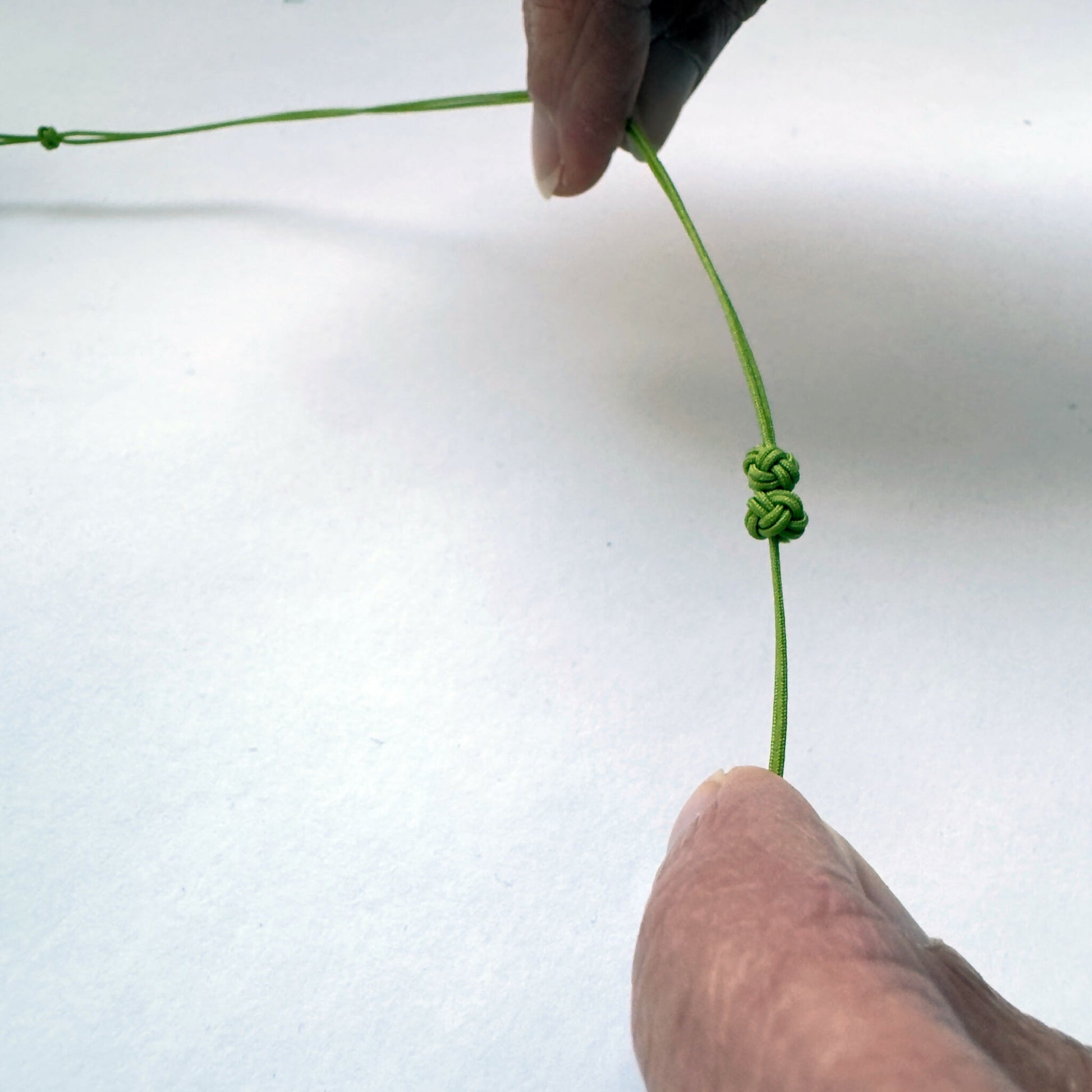 Pièce réalisée à partir de la technique des nœuds coréens. Teintes printanières (dégradés de vert, de rose et de prune)