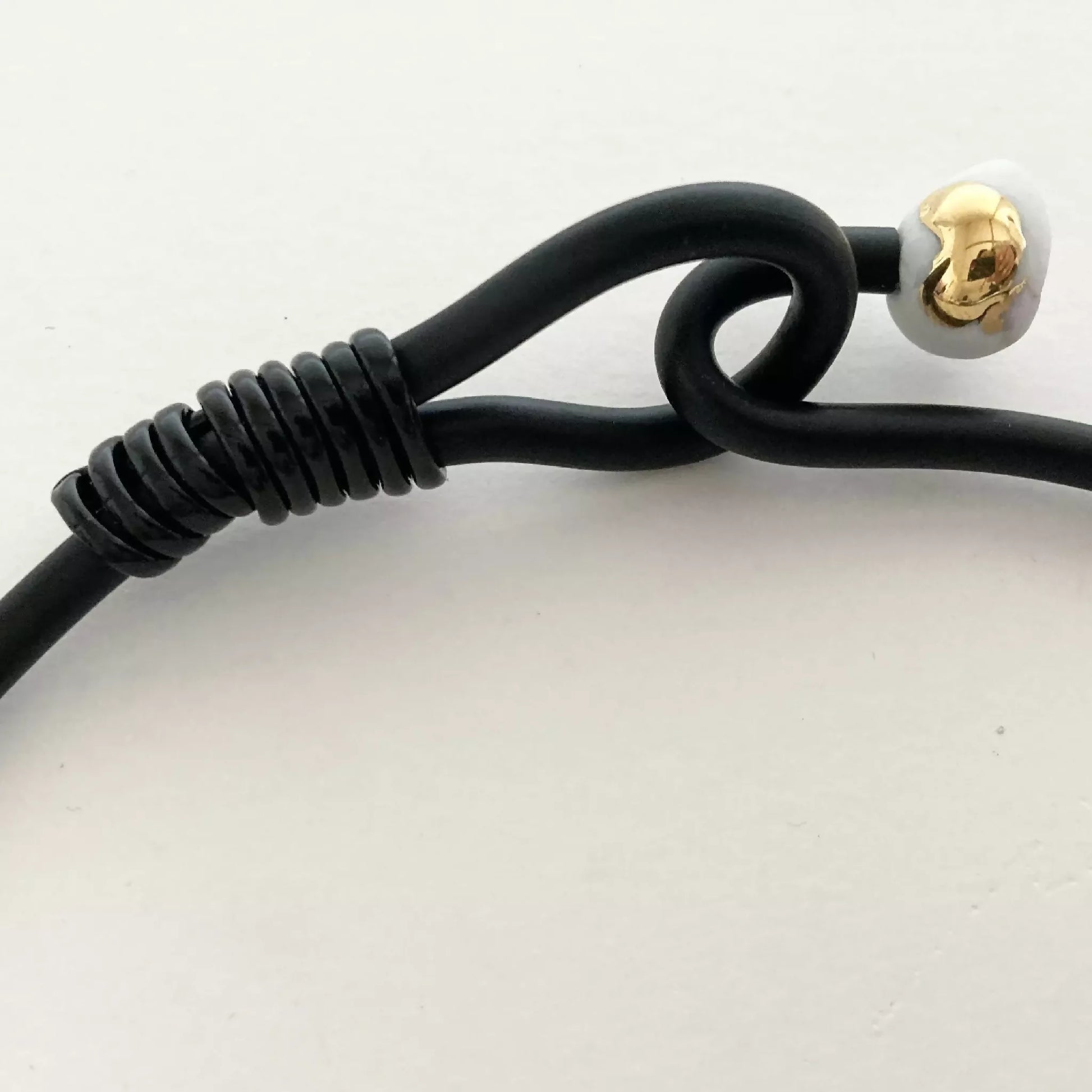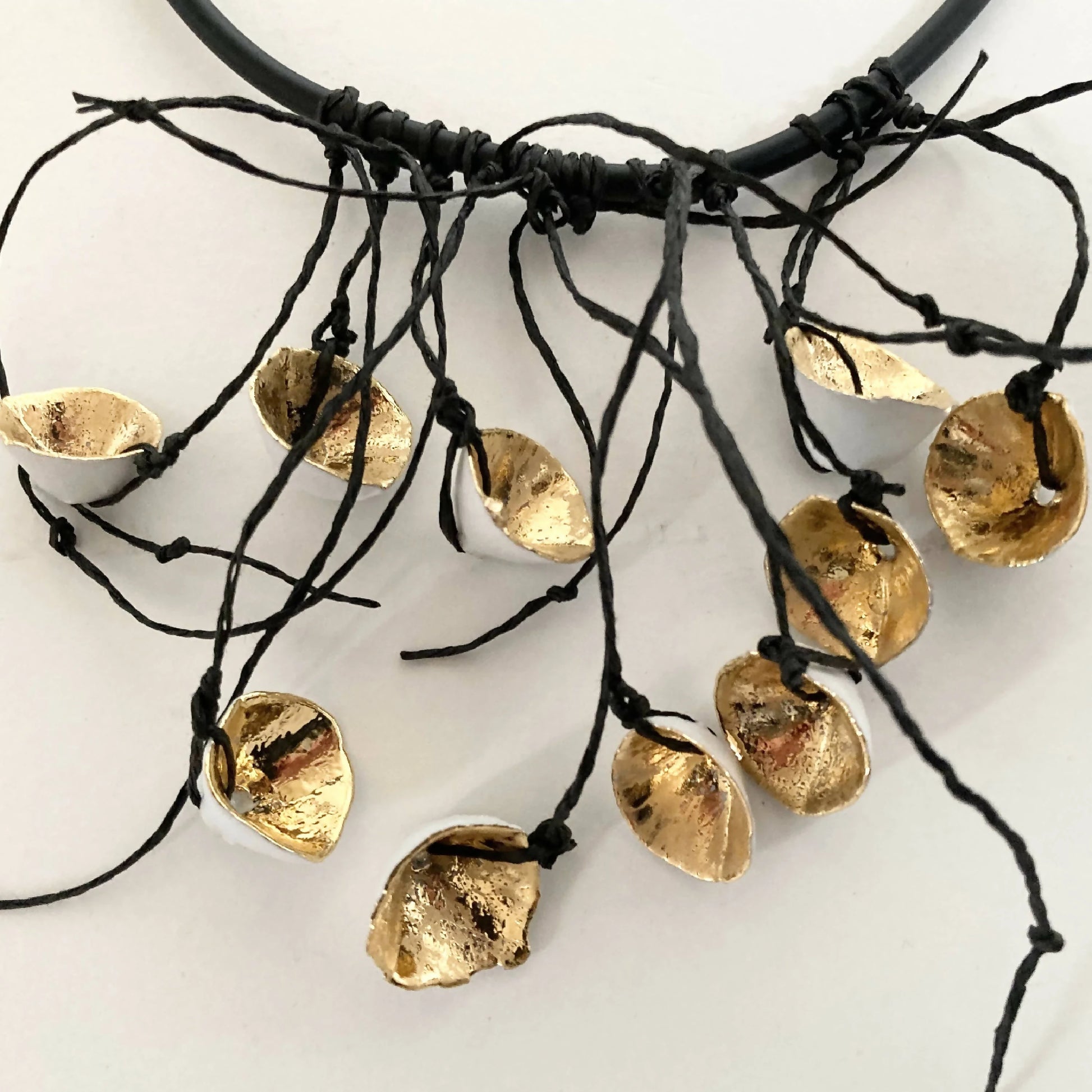 Collection "Fleur de printemps" 5. Plus qu'une parure de corps, une sculpture à porter. Pièce unique, aux matières précieuses, de porcelaine au décor d'or liquide. Le cordon est en caoutchouc noir mat. Les fils sont en ficelle de papier blanc. Ce bijou d'artiste unique est créé pour vous.