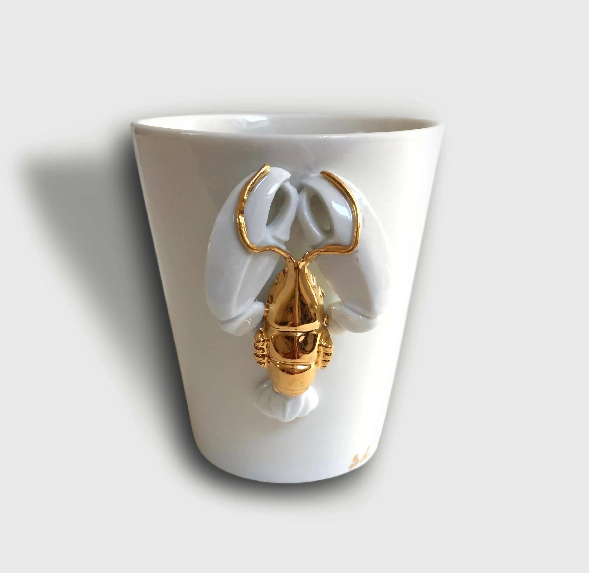 Mug homard en porcelaine émaillée blanc et décorée à l'or fin. Chaque pièce est signée, et intégralement réalisée par l'artiste dans son atelier.