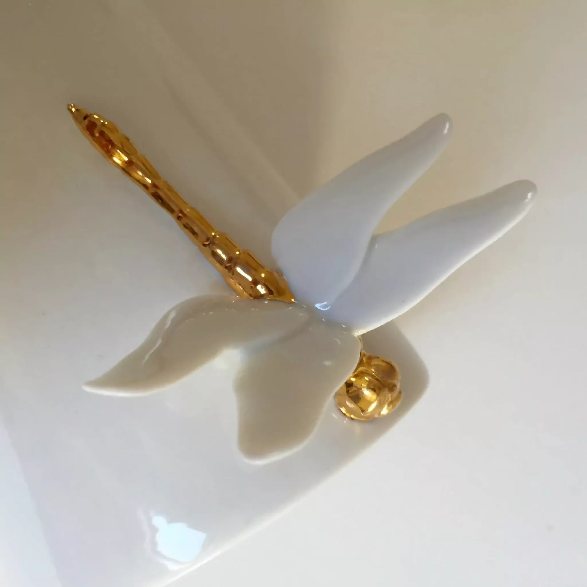 Mug libellule en porcelaine émaillée blanc et décorée à l'or fin, contenance 1/3 de litre. Chaque pièce est signée, et réalisée en petite série, intégralement, dans mon atelier des Deux-Sèvres, par les techniques traditionnelles de la porcelaine.