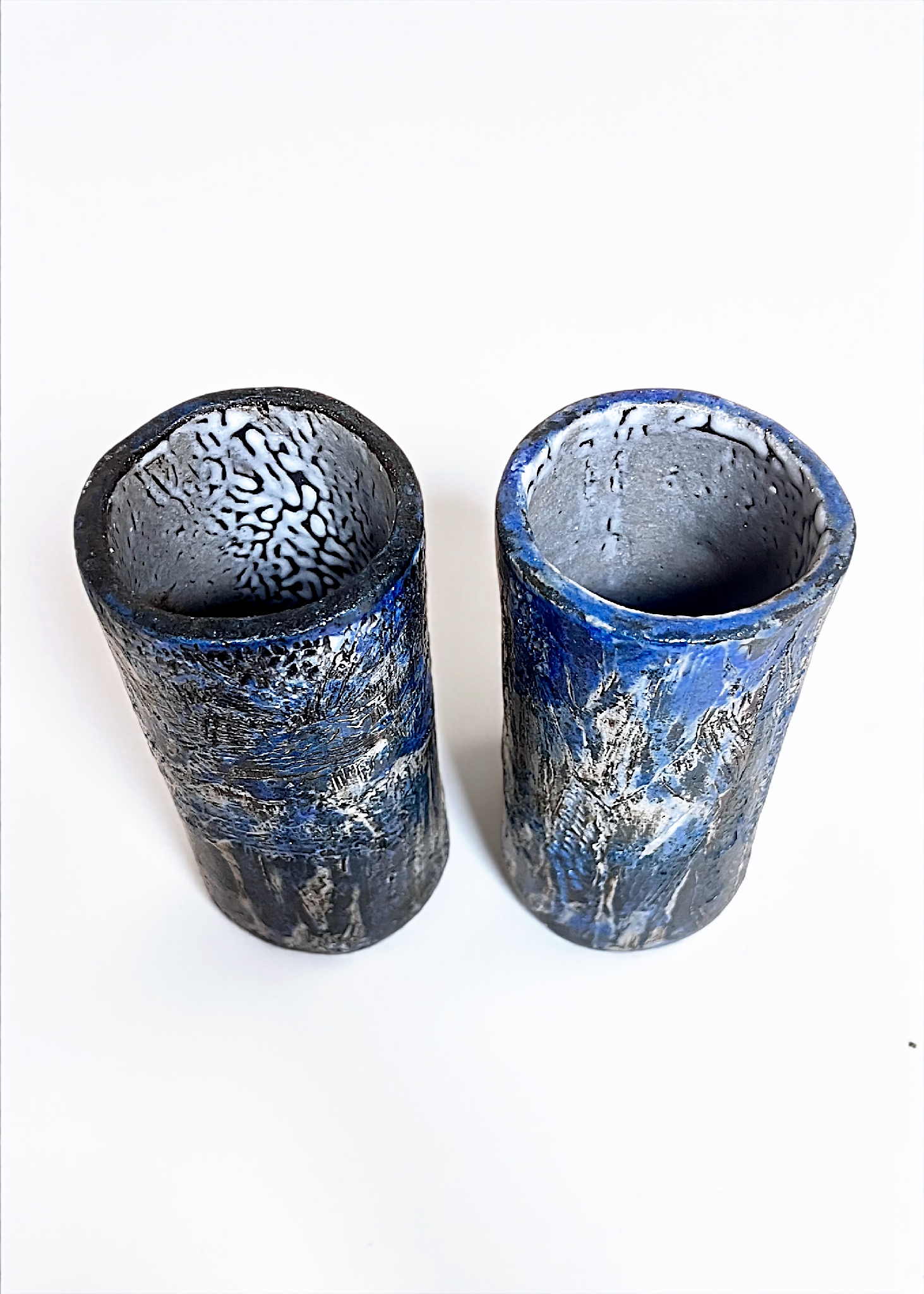 Découvrez cette magnifique paire de vases cylindriques en grès noir, sublimés par un travail de décor à la pointe et émaillés dans des nuances de bleu cobalt et de blanc. Leurs surfaces texturées évoquent des paysages abstraits, comme des écorces d'arbres givrées.