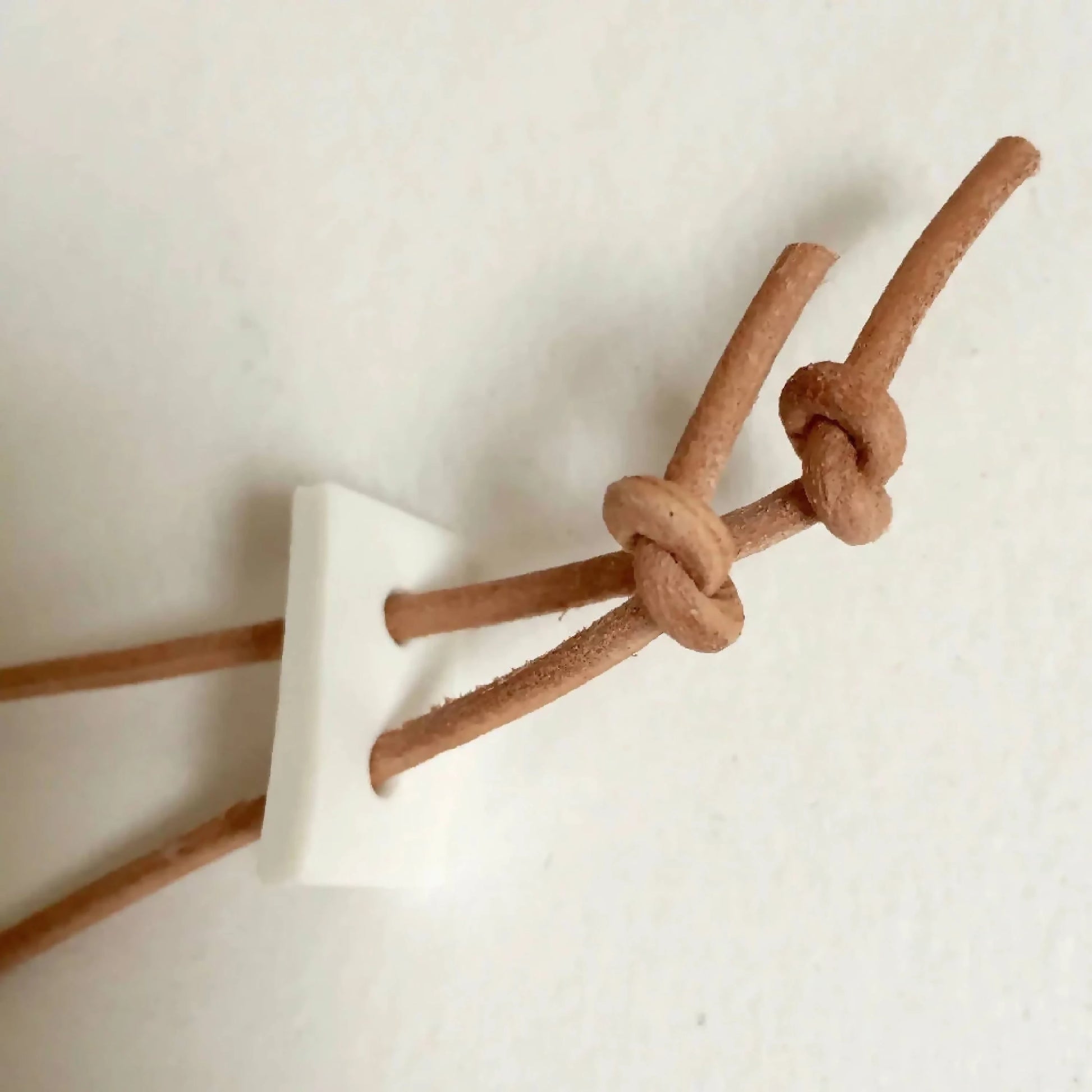 Collection "Les visages d'Aphrodite" Ce pendentif de porcelaine Blanc et Or, visage à la coiffure d'or ornée de deux feuilles de lierre d'or en chapeau, est une pièce unique sculptée aux matières précieuses, de porcelaine recouverte d'or liquide. L'attache réglable est faite d'un cordon de cuir naturel premier choix. Ce bijou d'artiste exclusif pour une personne unique affirmera votre désir de singularité.