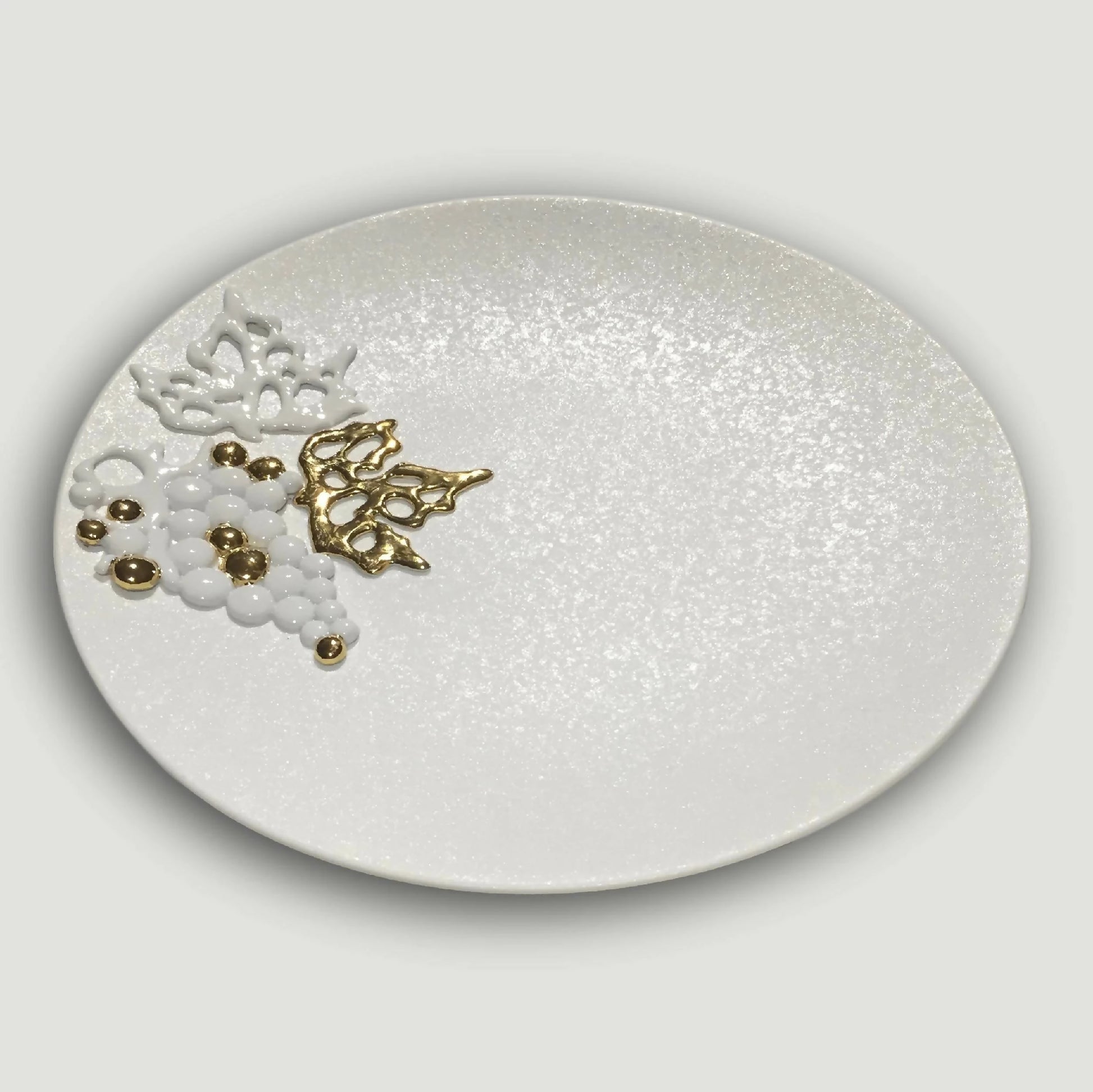 Plat vigne d'or en porcelaine émaillé et or fin. Décor pour les tables de fêtes, à la matière scintillante d'émail et de porcelaine. Chaque pièce est signée, et intégralement réalisée par l'artiste dans son atelier.