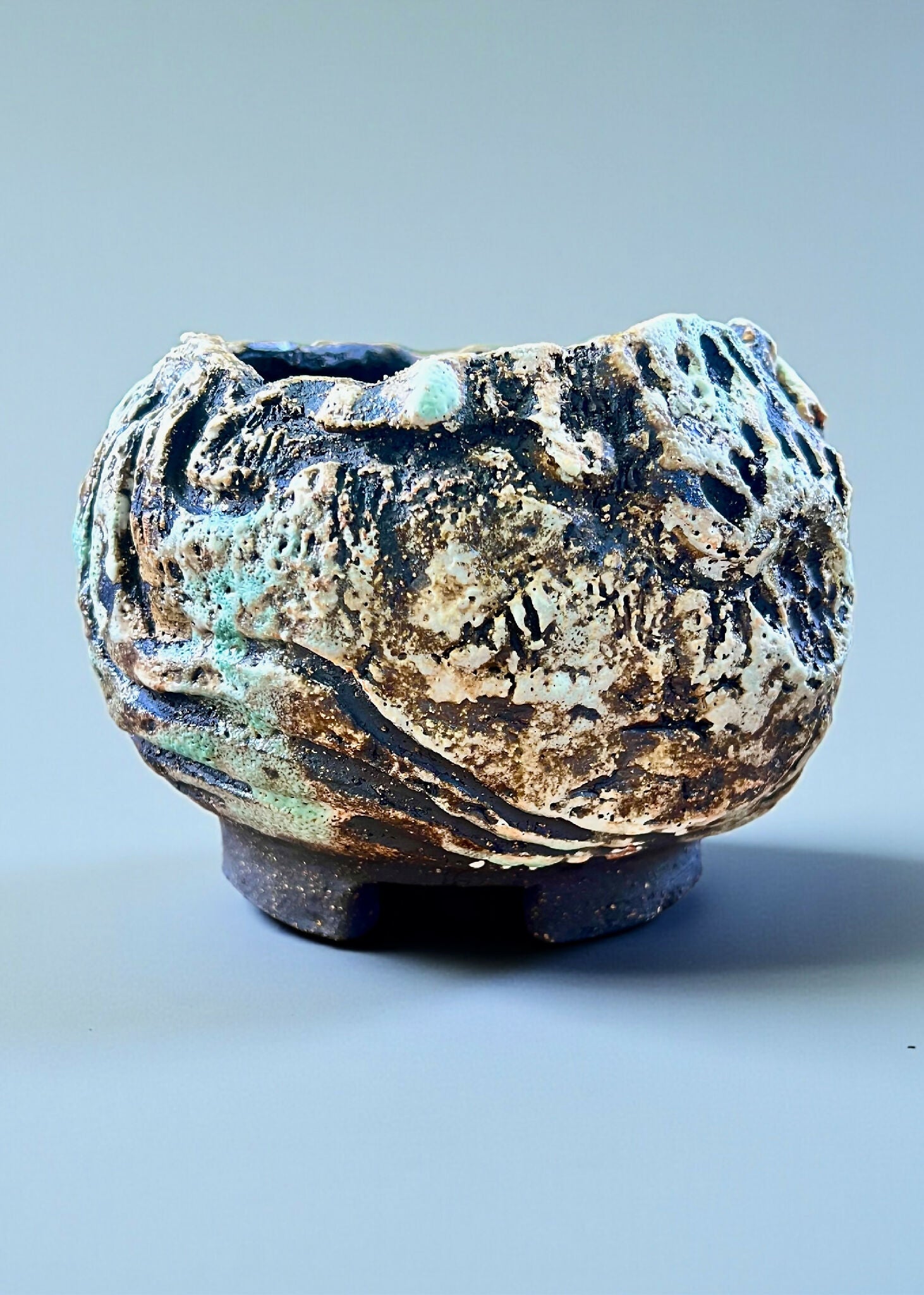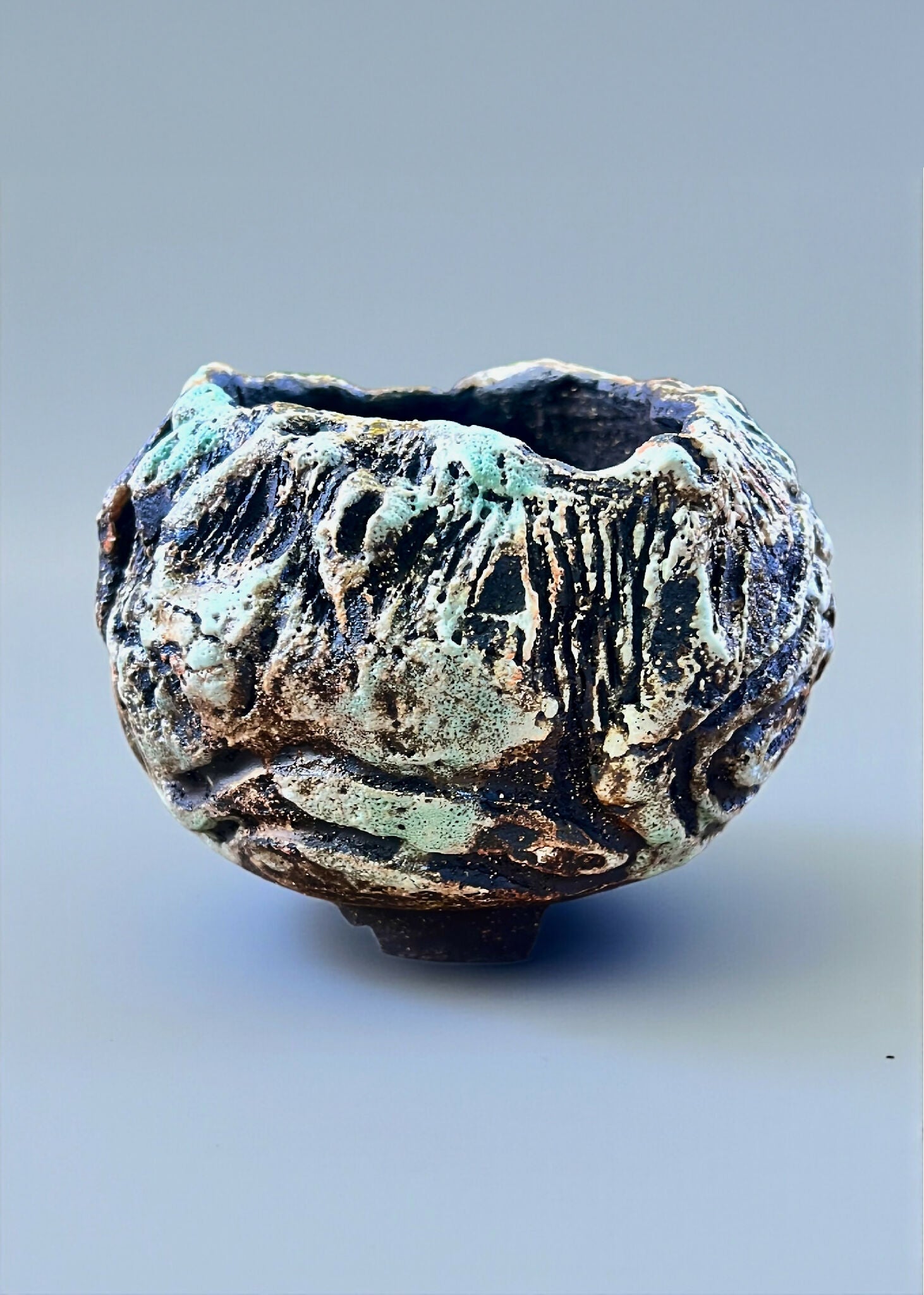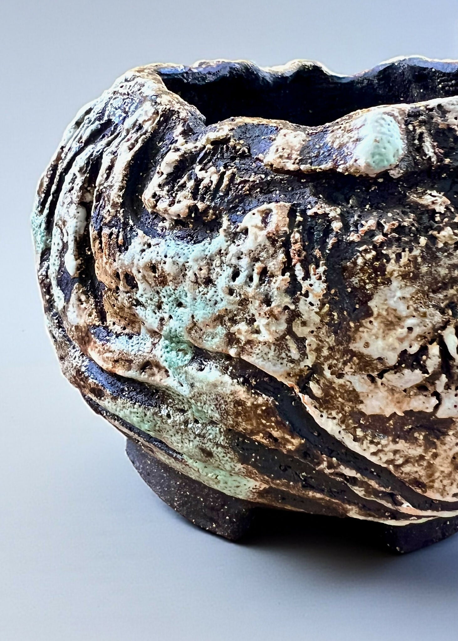 Découvrez ce magnifique pot caudex sculpté en grès noir, sublimé par un émail qui convoque les nuances bleutées et crème de la neige et du lichen.