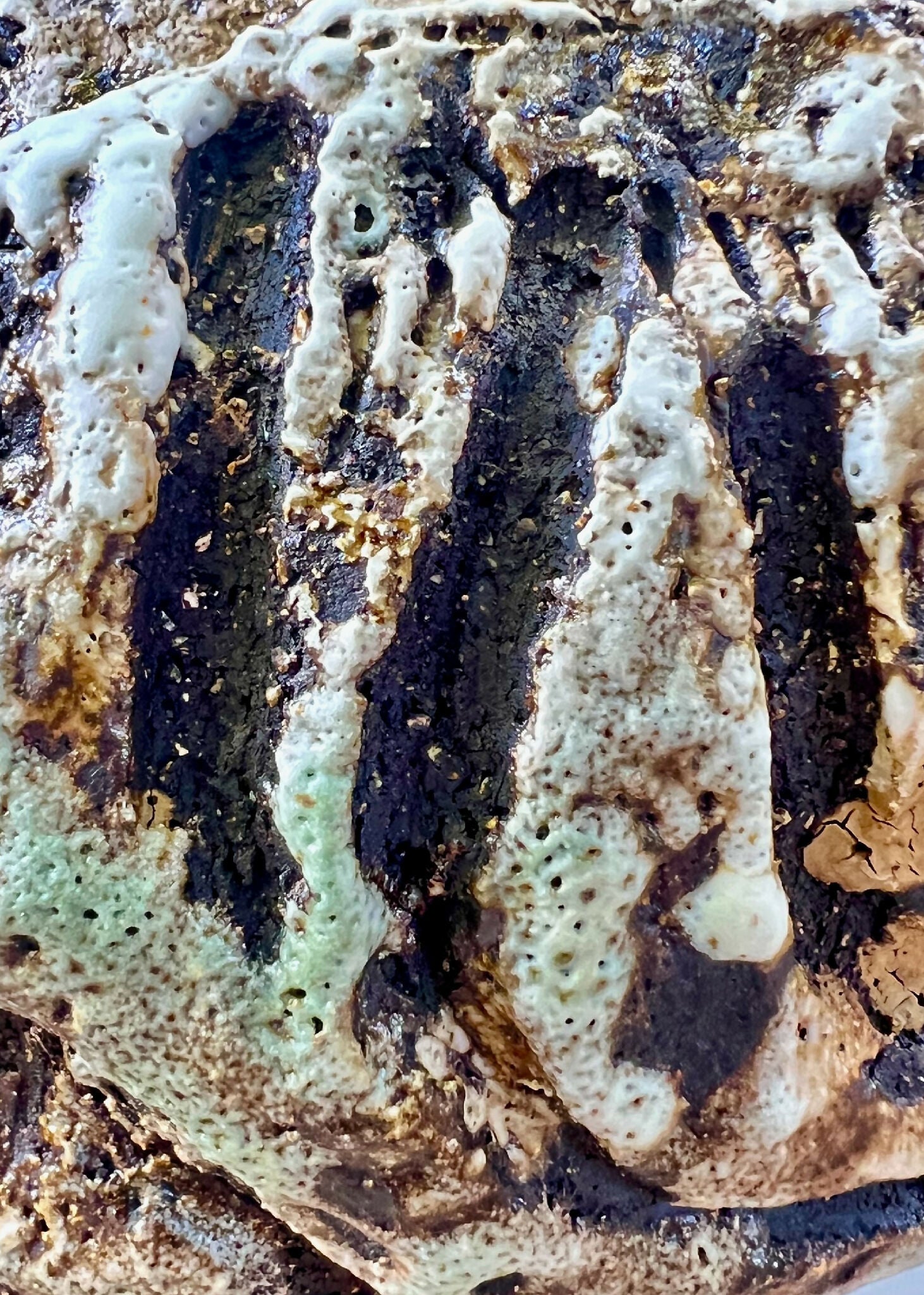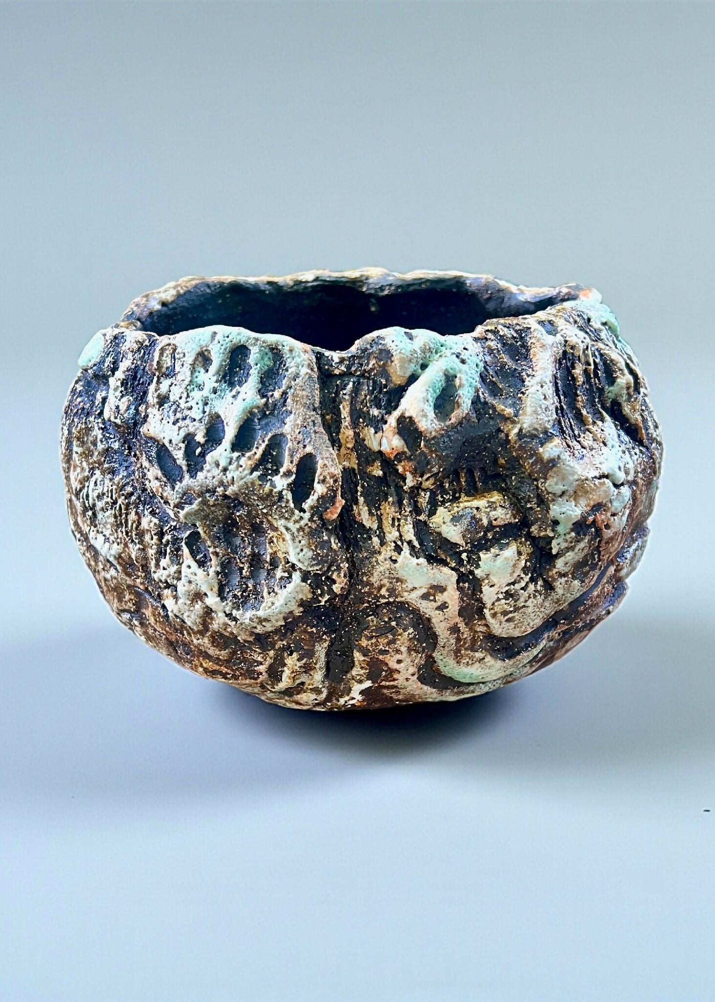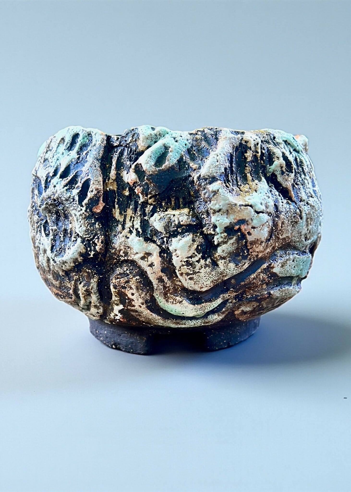 Découvrez ce magnifique pot caudex sculpté en grès noir, sublimé par un émail qui convoque les nuances bleutées et crème de la neige et du lichen.