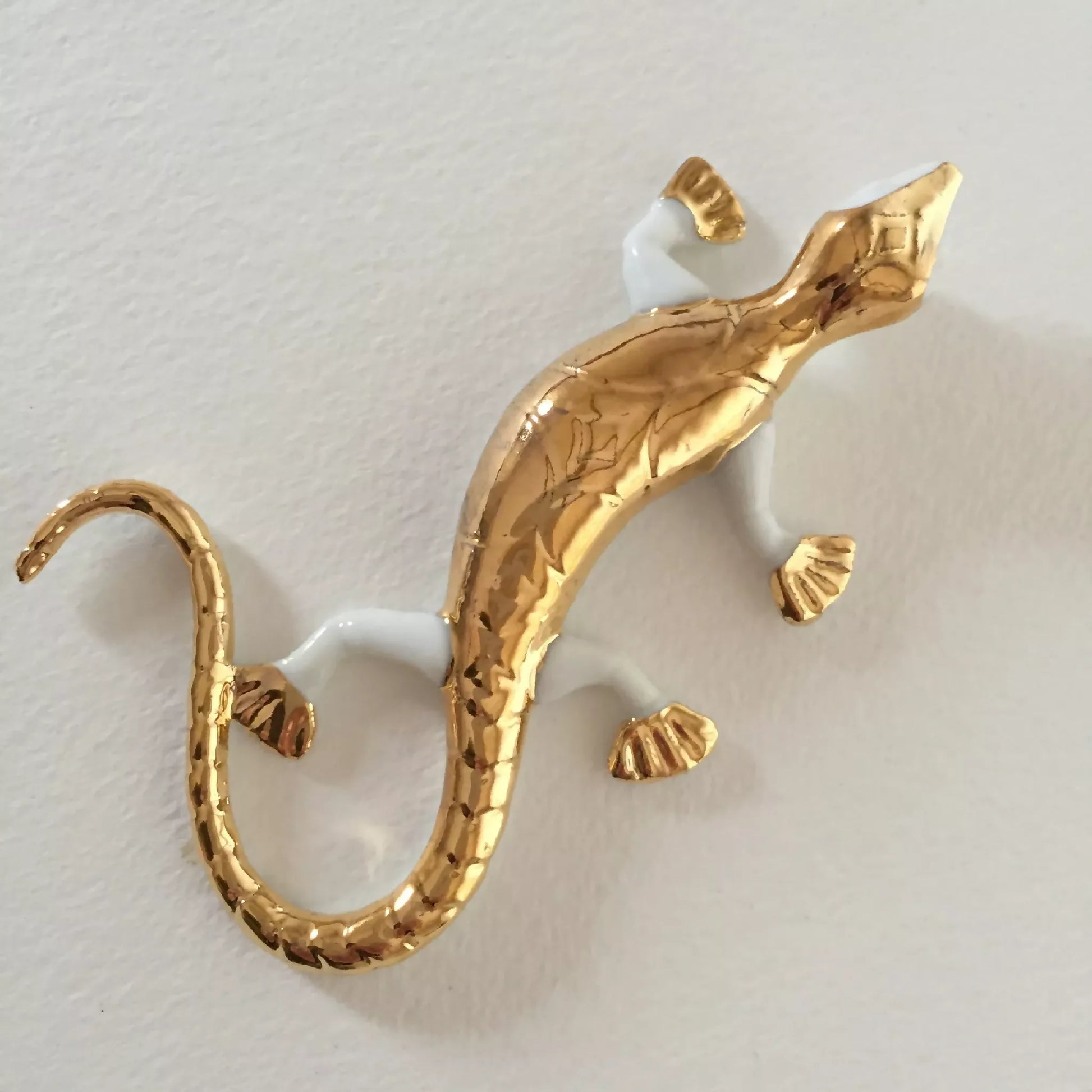 Salamandre en porcelaine, émail blanc, décor ou liquide.