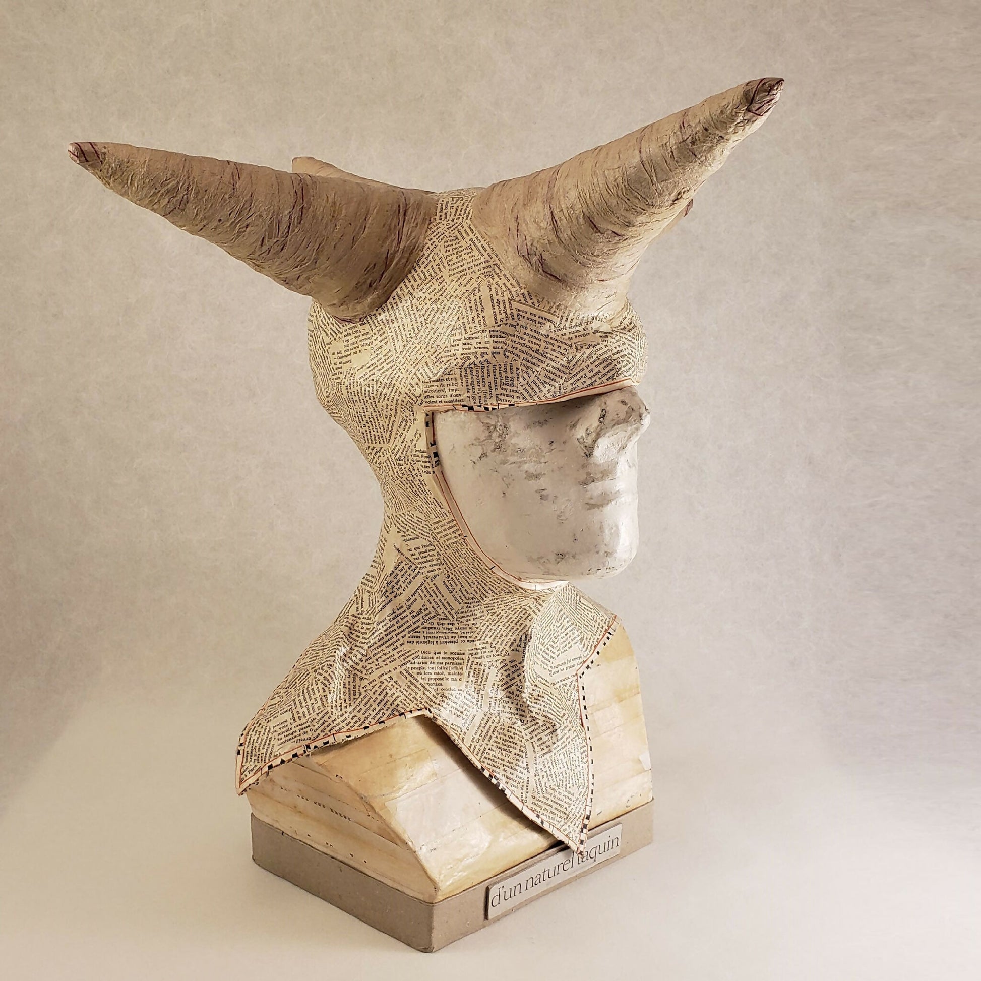 Buste en papier du fou du roi. "D'un naturel taquin" est coiffé de son bonnet, trop grand pour lui, il ne voit plus rien ! Réalisé avec une édition ancienne de Gargantua.