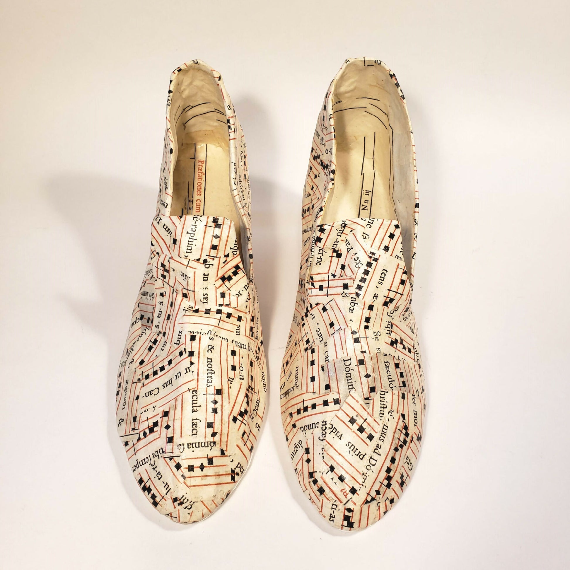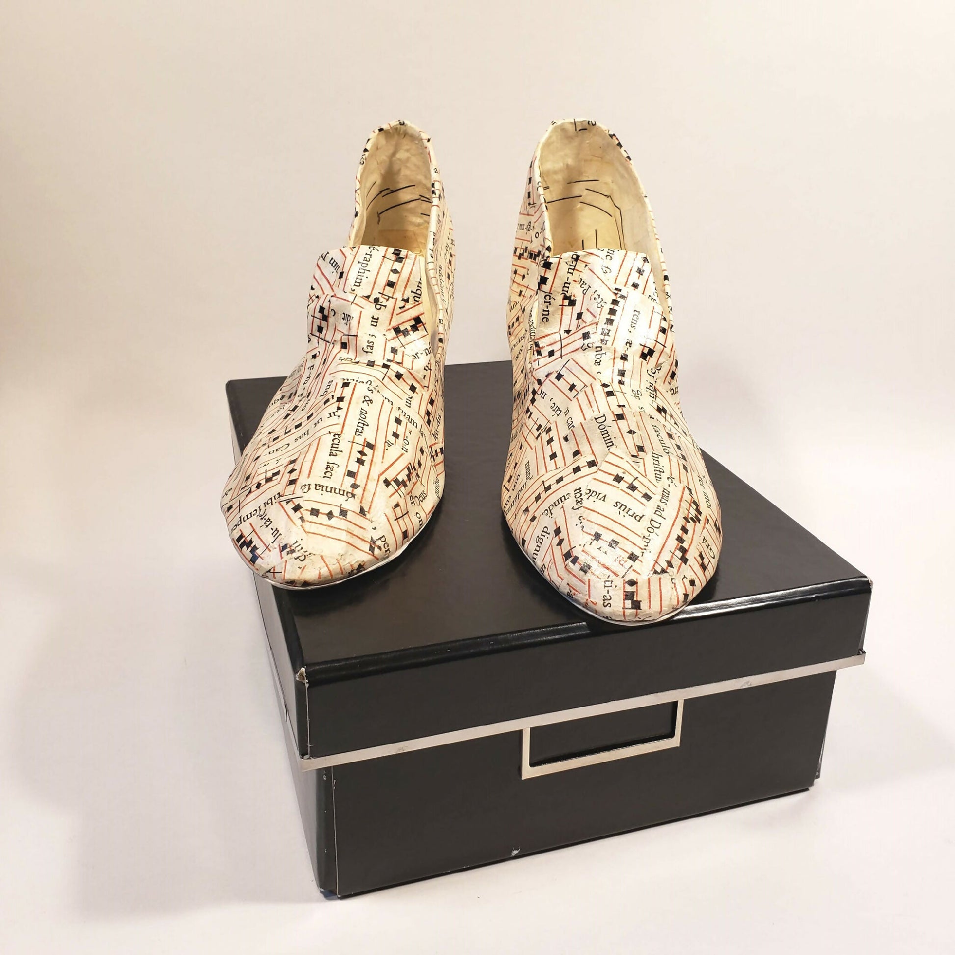 Matériau : Réalisé avec des pages d'un livre de chants grégorien, du carton. Les talons sont des cubes en bois