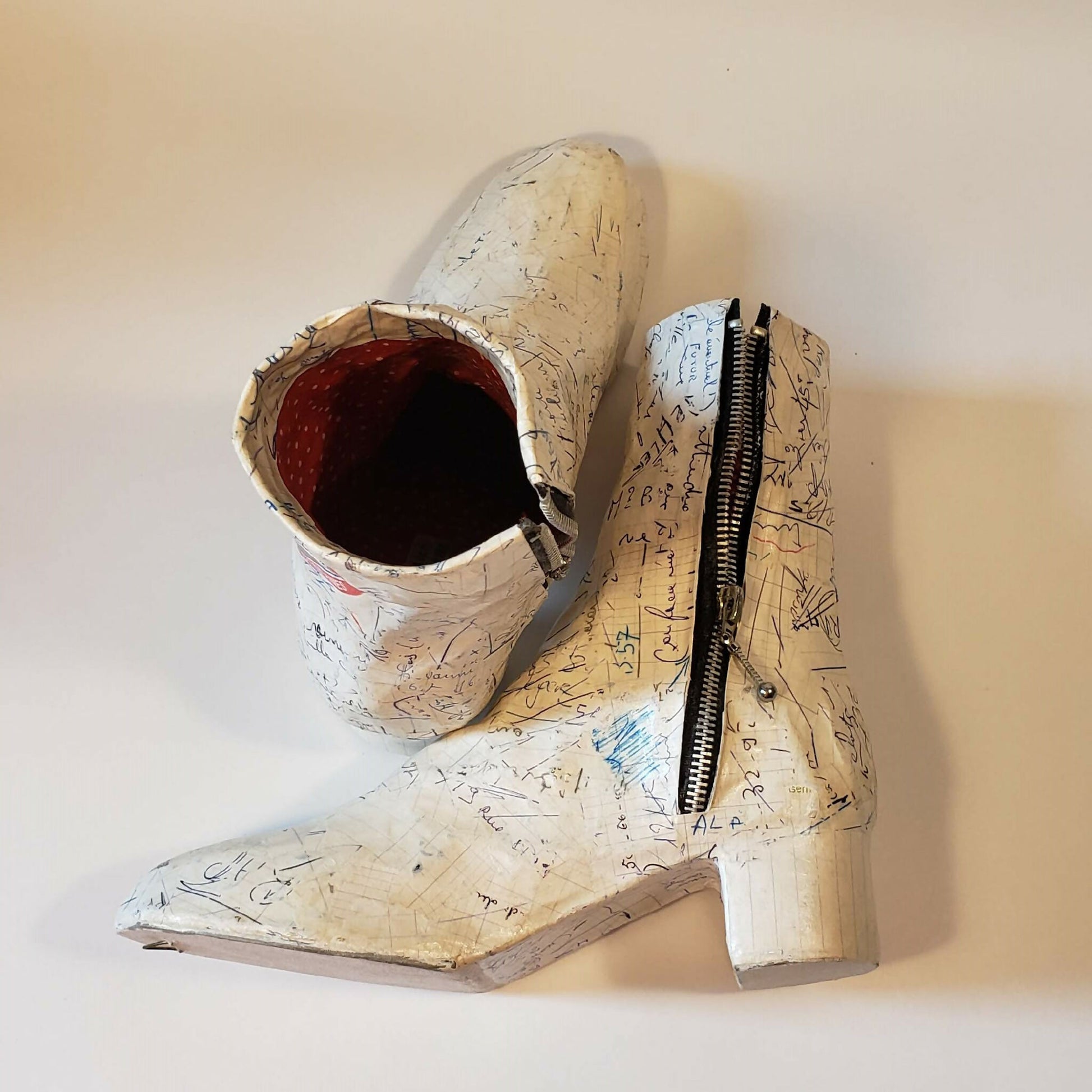 Matériau : Boots en papier mâché réalisées avec les pages d'un agenda professionnel de 1980. Le "logo" provient d'un papier de soie d'orange !
