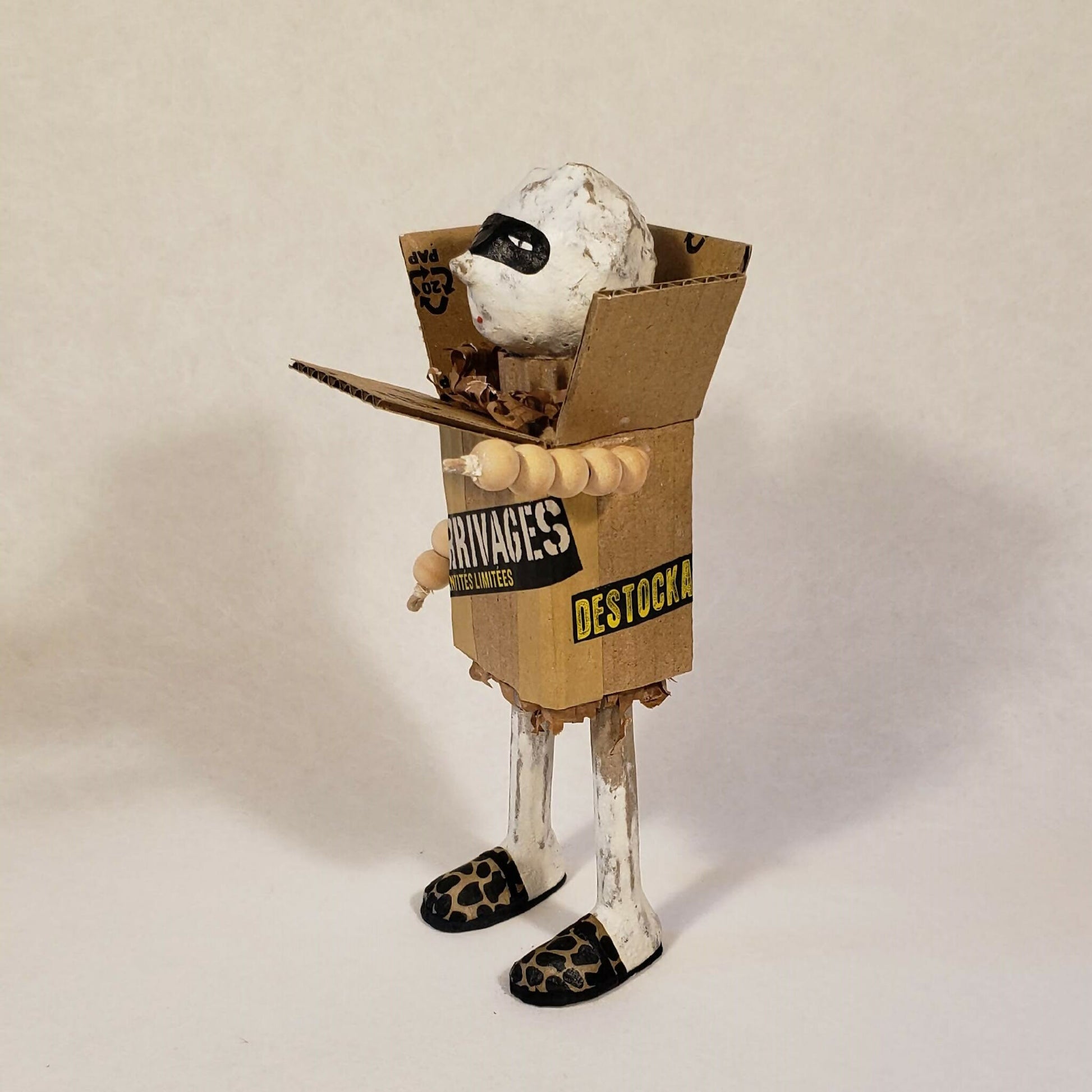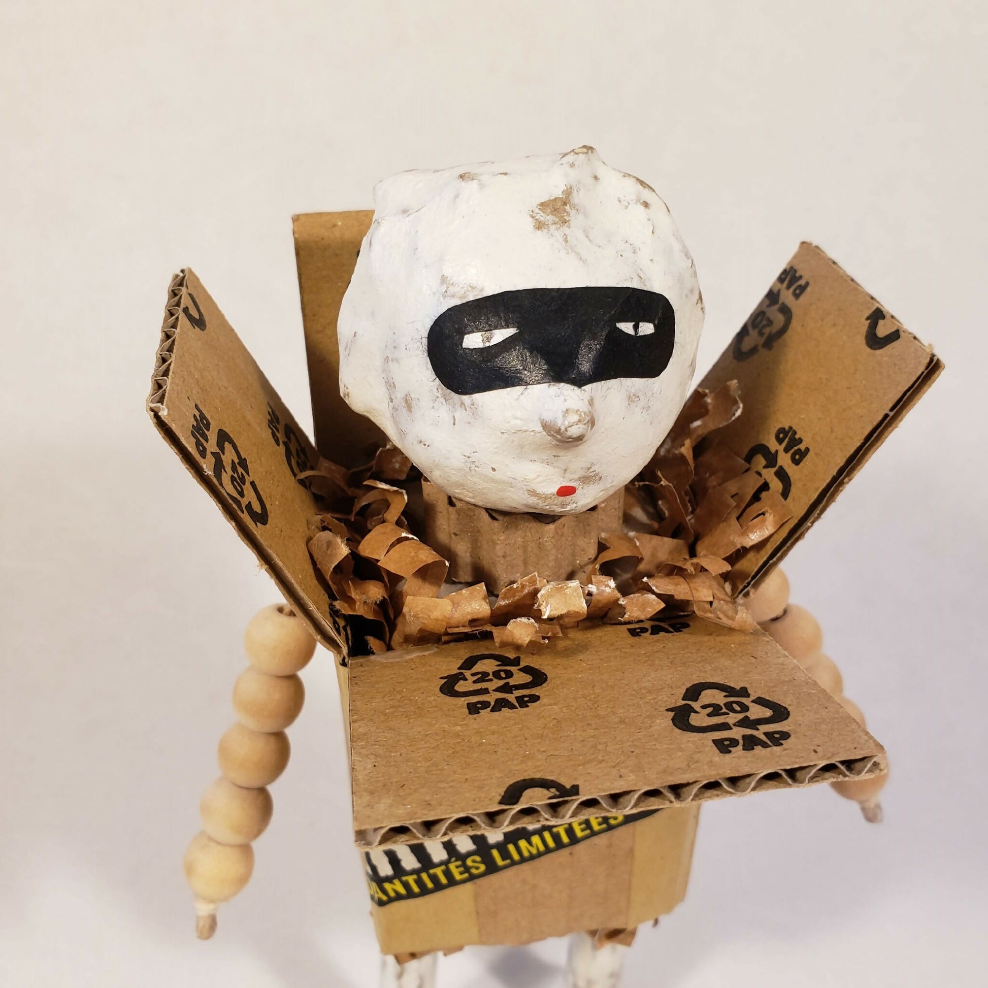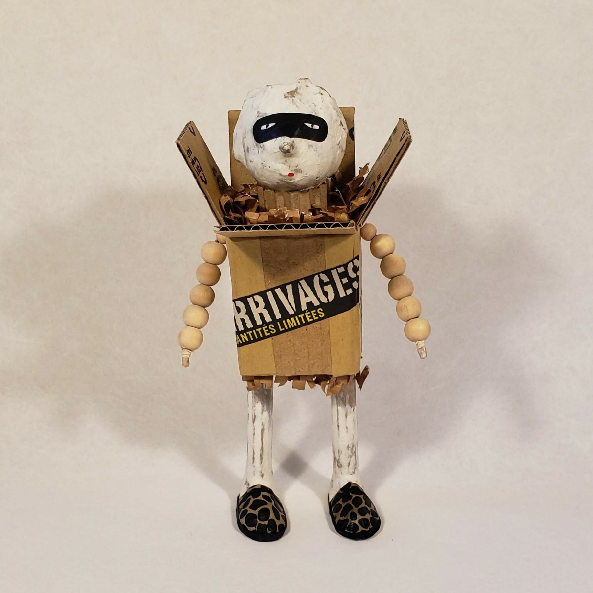 Petit colis est un petit personnage masqué, enveloppé d'un carton, timbré, étiqueté. Ses bras en perles de bois dépassent sur les côtés, ses pieds sont chaussés de savates panthère.
