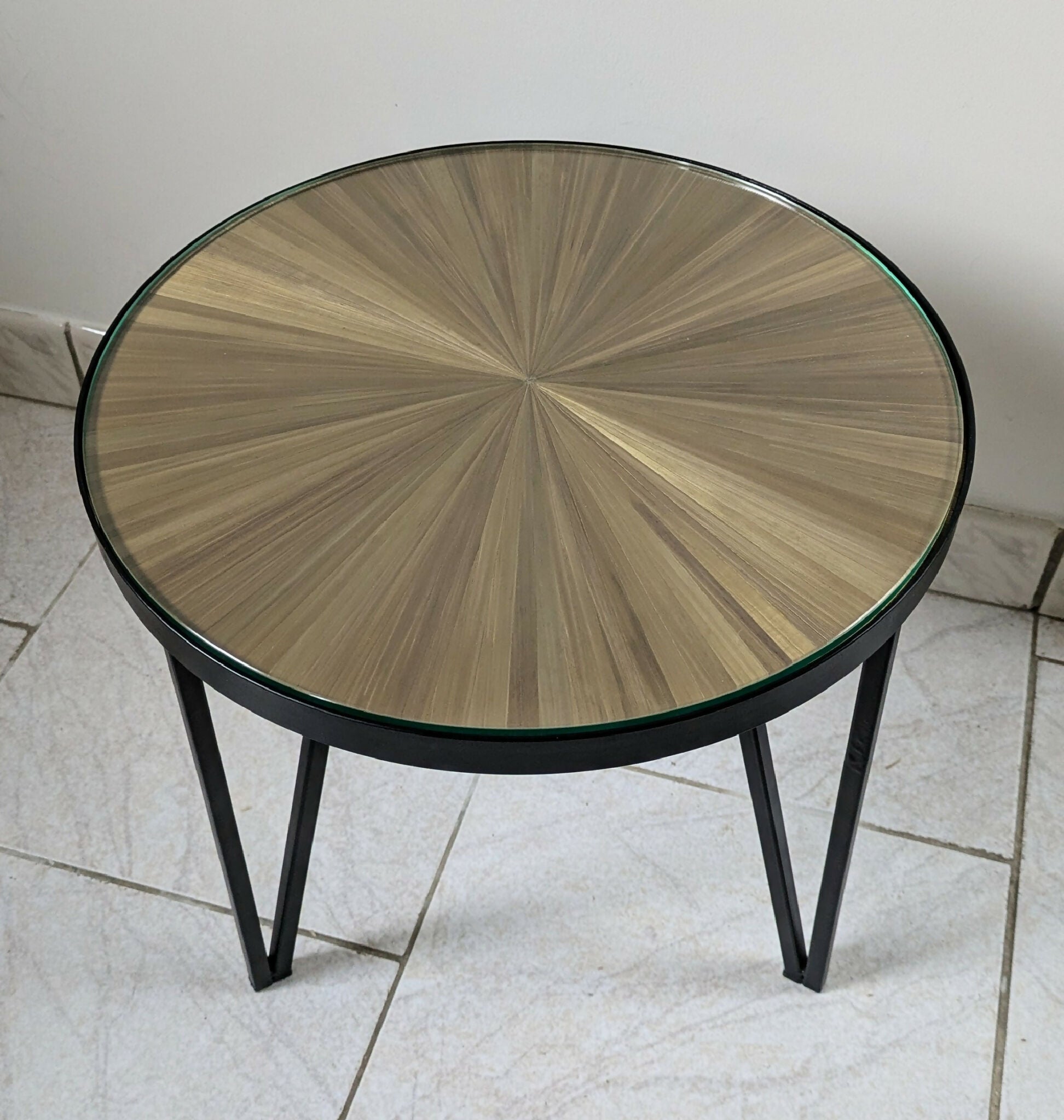 Petite table d'appoint chinée et restaurée que j'ai ornementé de Marqueterie de Paille dorée, motif soleil.Les pieds sont en métal peint de couleur noire avec des patins en plastique. J'ai ajouté un plateau en verre trempé d'épaisseur 6mm afin de protéger la marqueterie.