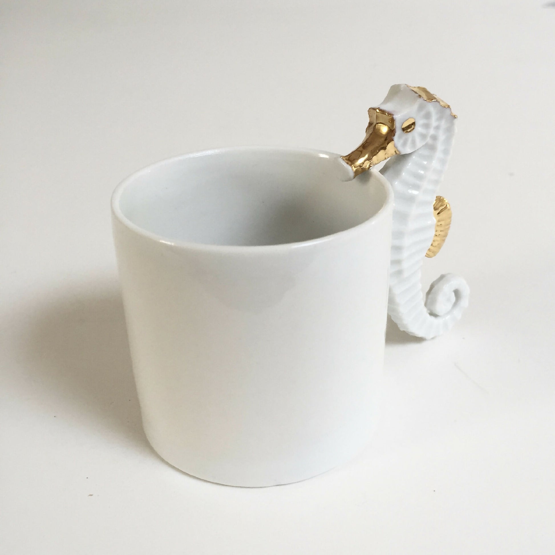 Tasse hippocampe en porcelaine émaillée blanc et décorée à l'or fin.