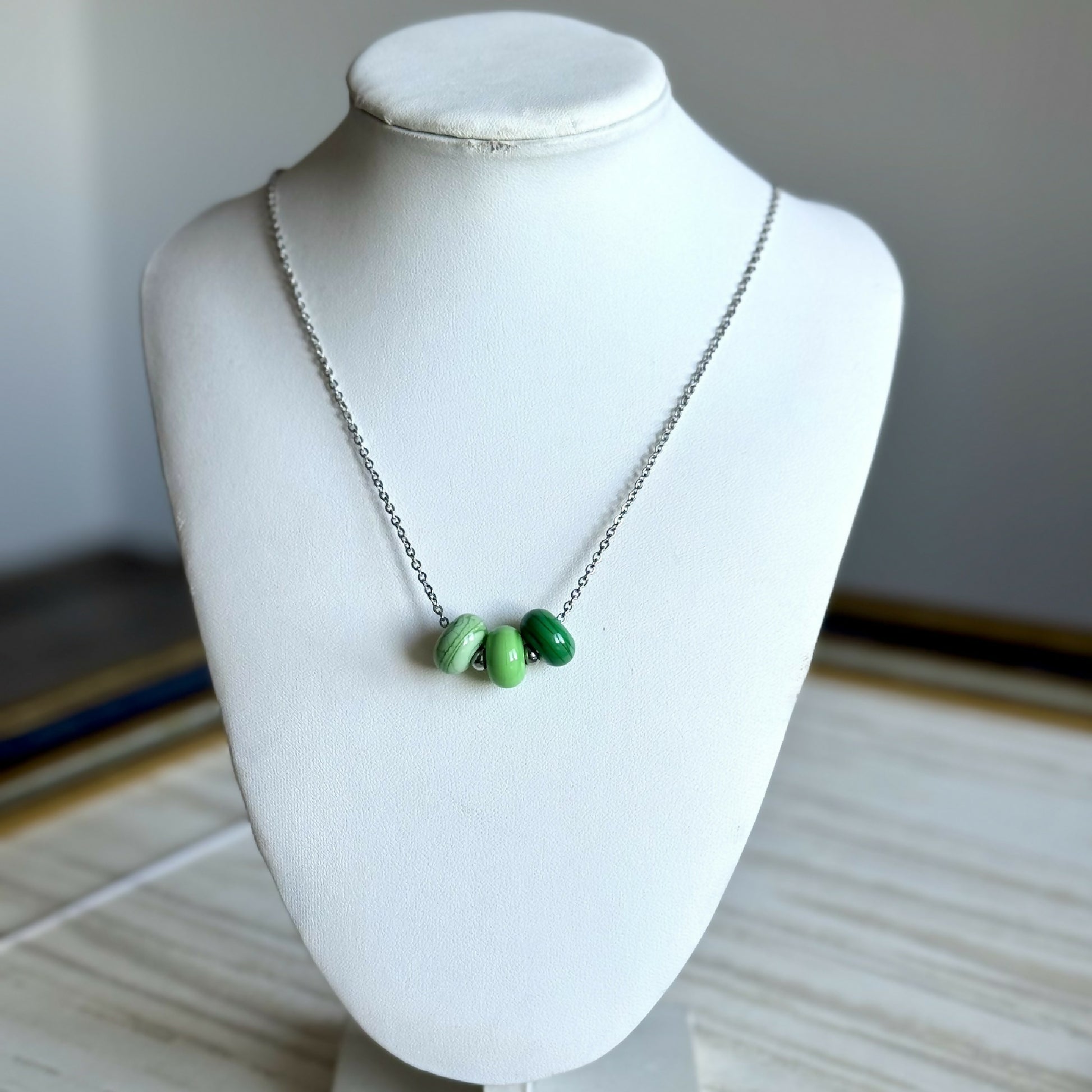 Ce bijou est composé de 3 perles vertes opaques soigneusement sélectionnées.