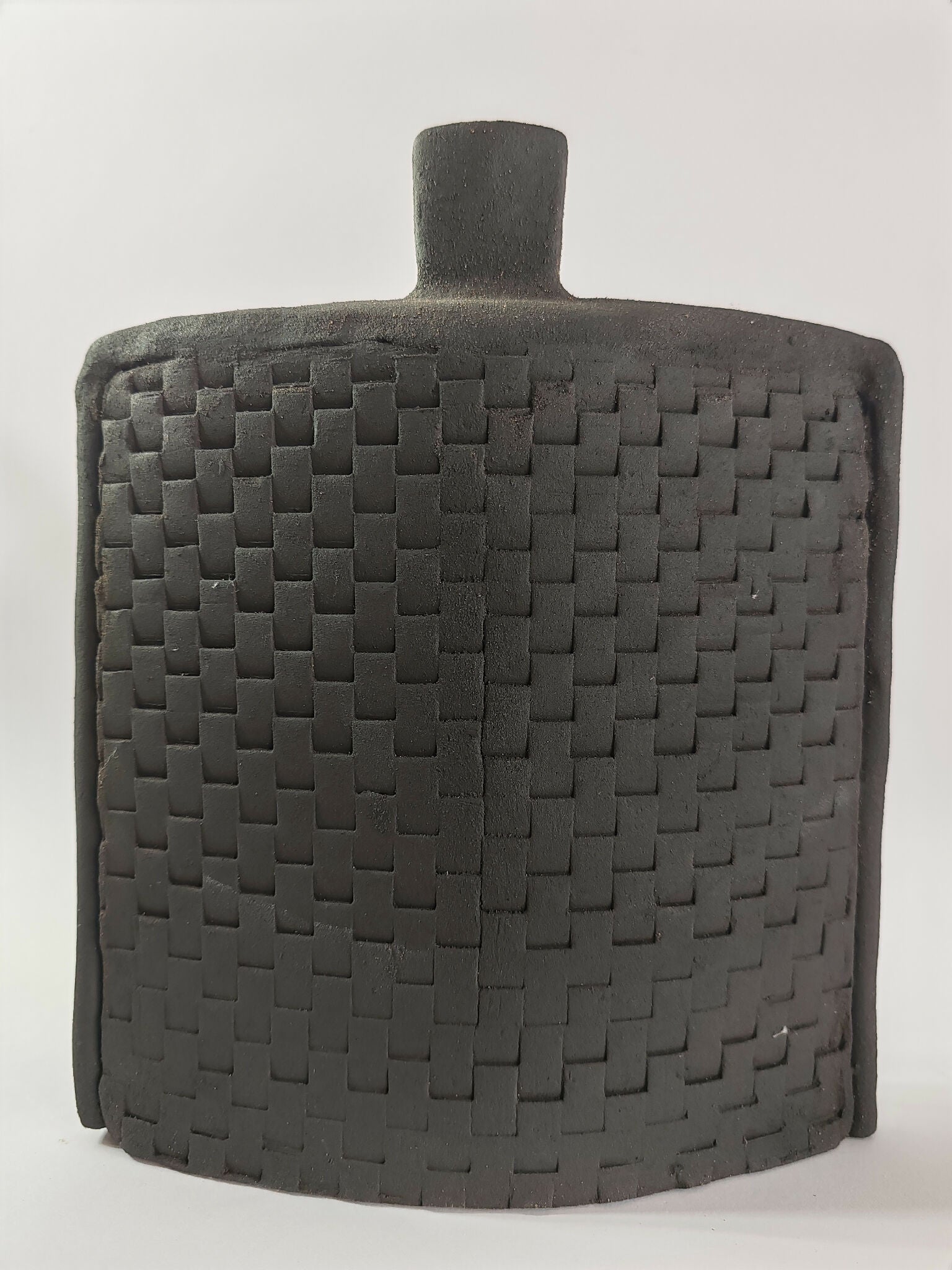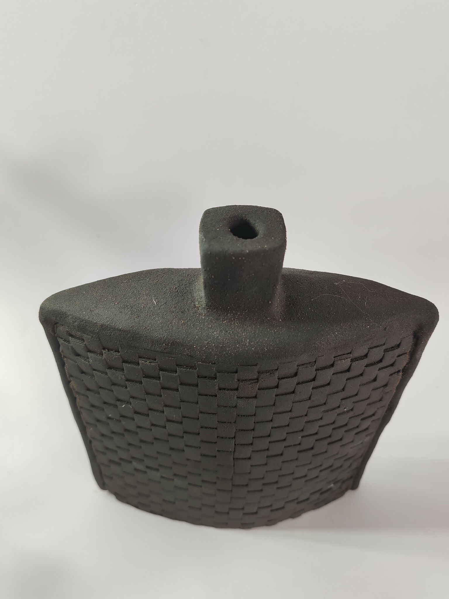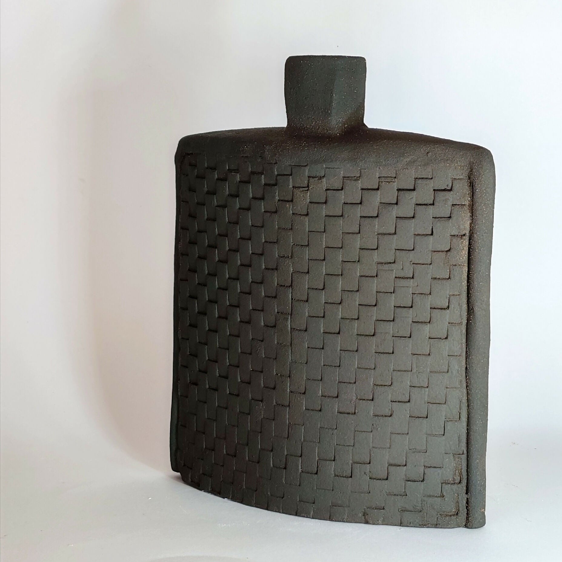 Entre vase et sculpture, Damier noir affirme une présence architecturale par ses lignes simples et sa surface texturée.