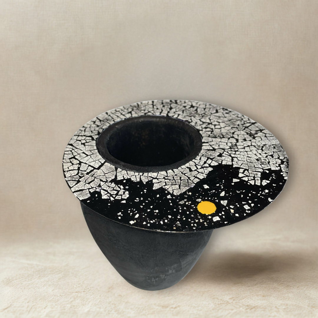 Vase corps en bois brûlé (Yakisugi technique japonaise) et dessus désaxé en laque et rankaku (coquilles d’œuf)